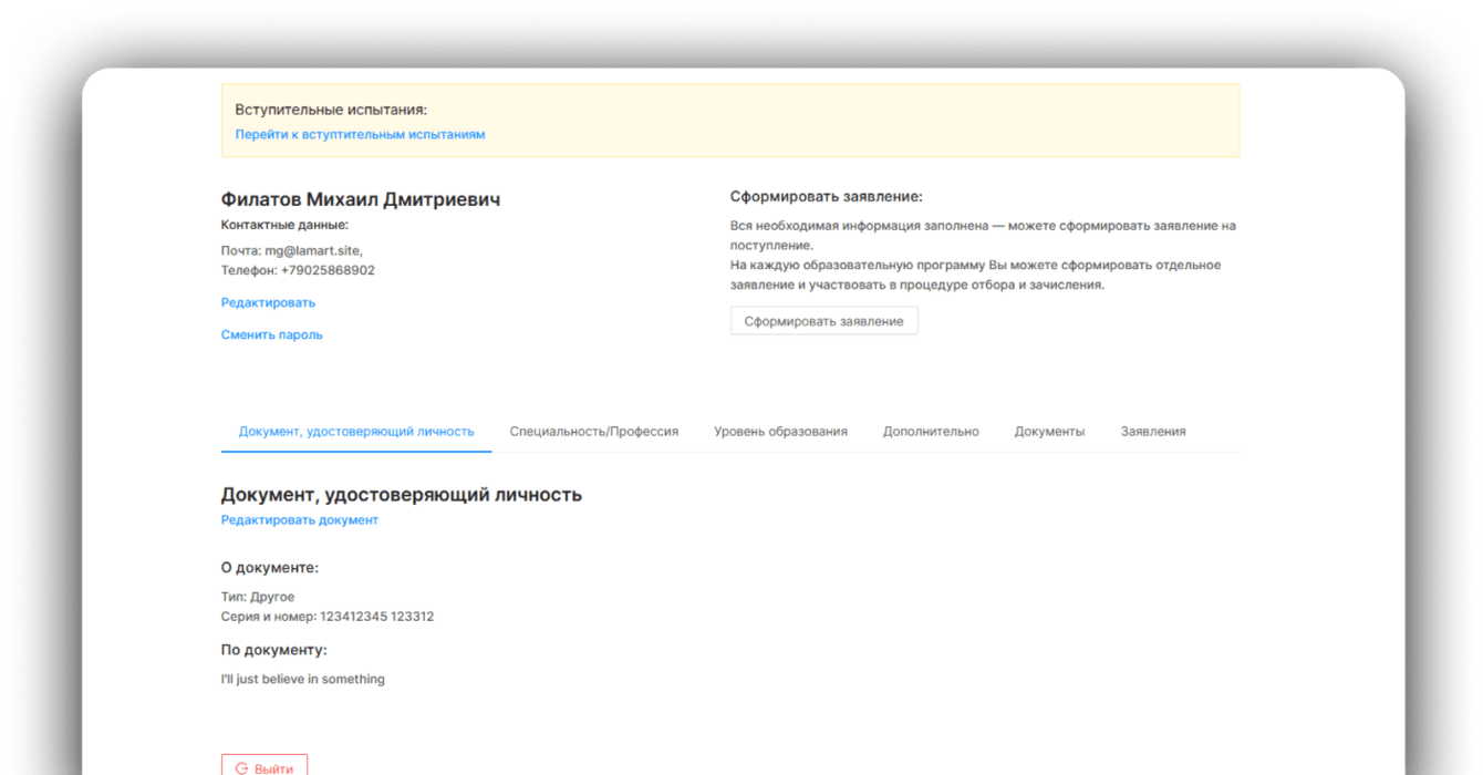 Во время промышленной эксплуатации добавили функциональность с возможностью записи на вступительные испытания и их прохождения.