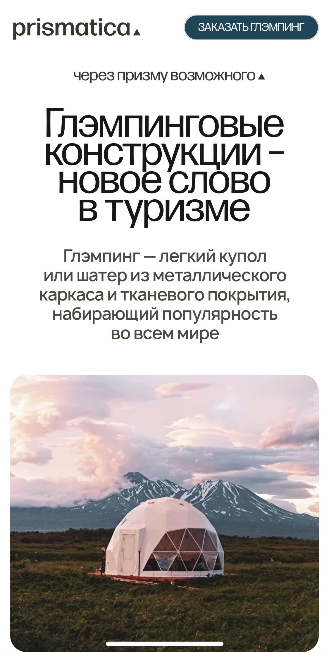 Сотрудничество с командой по созданию нашего веб-сайта было невероятно продуктивным. Они внимательно выслушали наши пожелания, предложили креативные решения и учли все наши замечания. Сайт получился стильным, функциональным и очень удобным для пользователей. Уже видим рост интереса к нашим глэмпингам, что очень радует! Искренне рекомендуем эту команду!