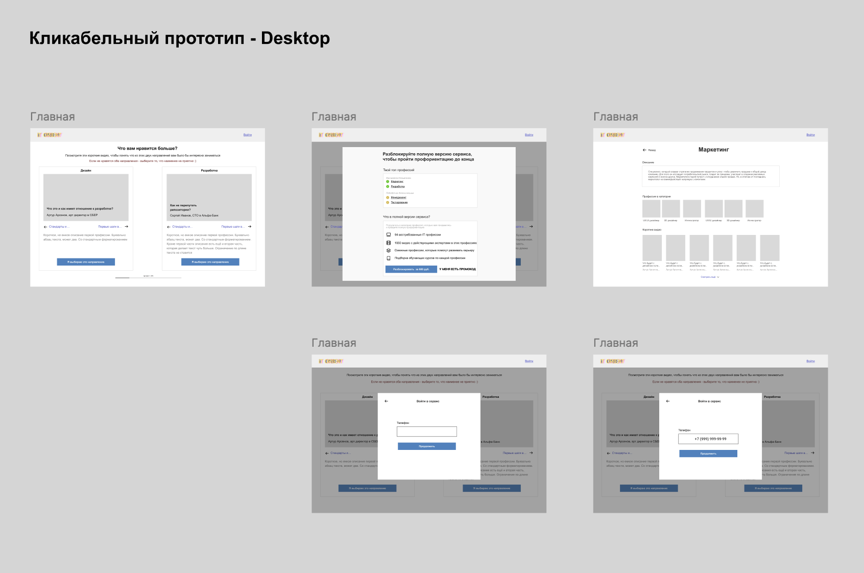Для детального обсуждения пользовательского опыта были созданы кликабельные прототипы для веб и мобильной версии. Это позволило уменьшить количество последующих итераций в дизайне
