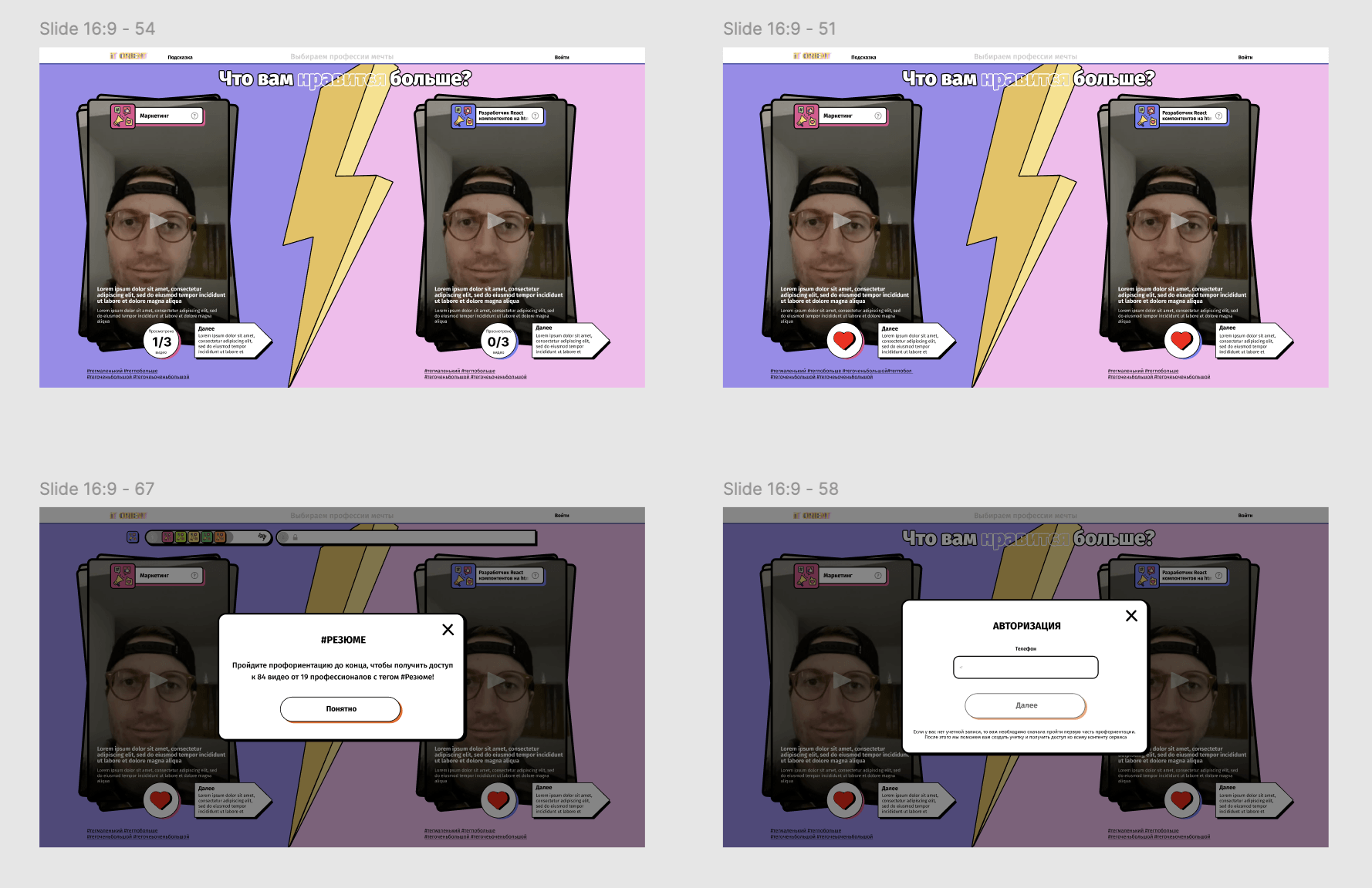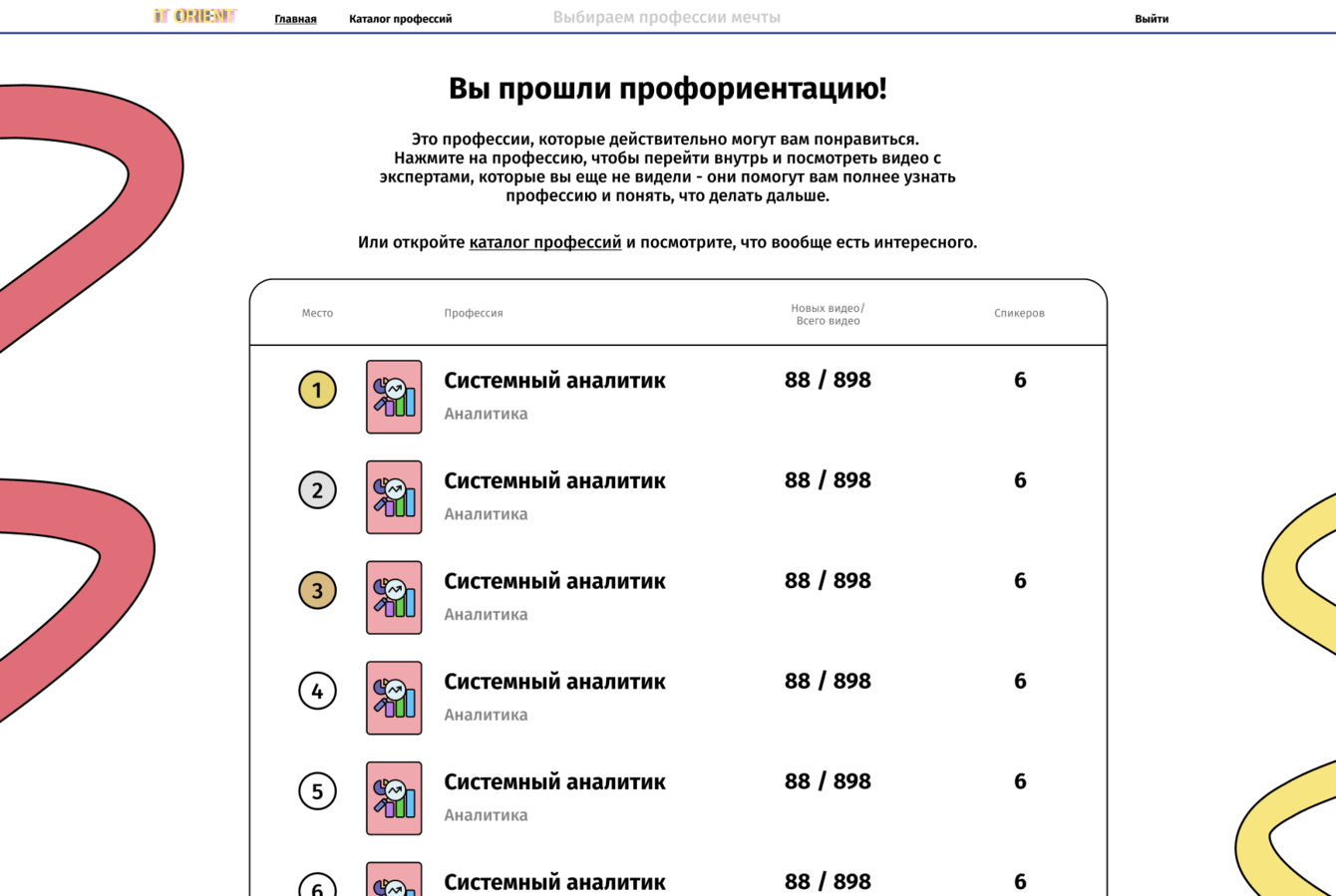 Был разработан веб-сервис (десктоп + адаптив), позволяющий пользователям смотреть видео и оценивать их, тем самым выбирая более понравившуюся специальность - проходить профориентацию.