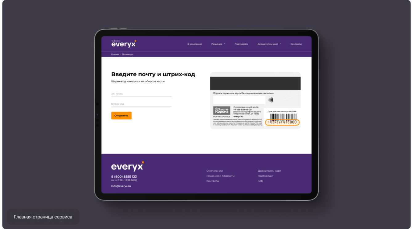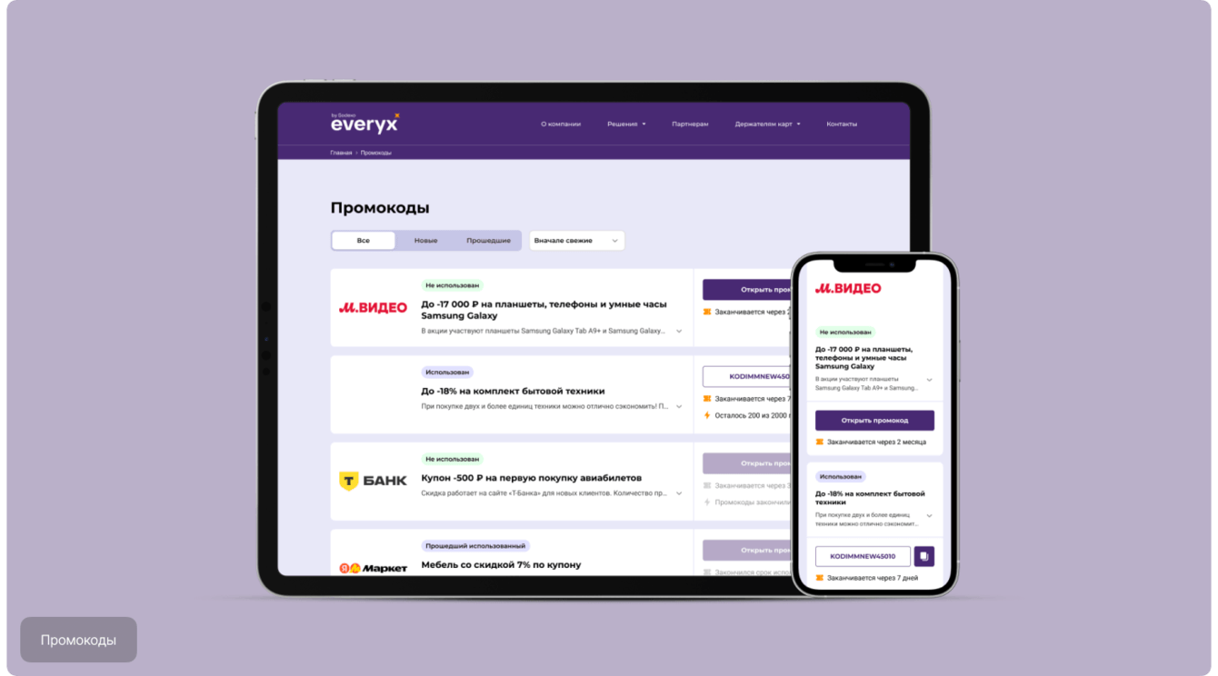 На этот раз Everyx обратились к нам за разработкой веб-сервиса предоставления промокодов от партнёров для держателей подарочных карт Everyx.