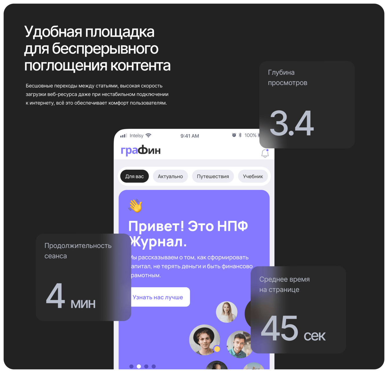 Главная задача веб-журнала — помочь читателям определиться с инструментами для долгосрочного инвестирования, разобраться в страховых предложениях, изучить продукты для предпринимателей и самозанятых. Тем самым сподвигнуть аудиторию к сотрудничеству с НПФ.
