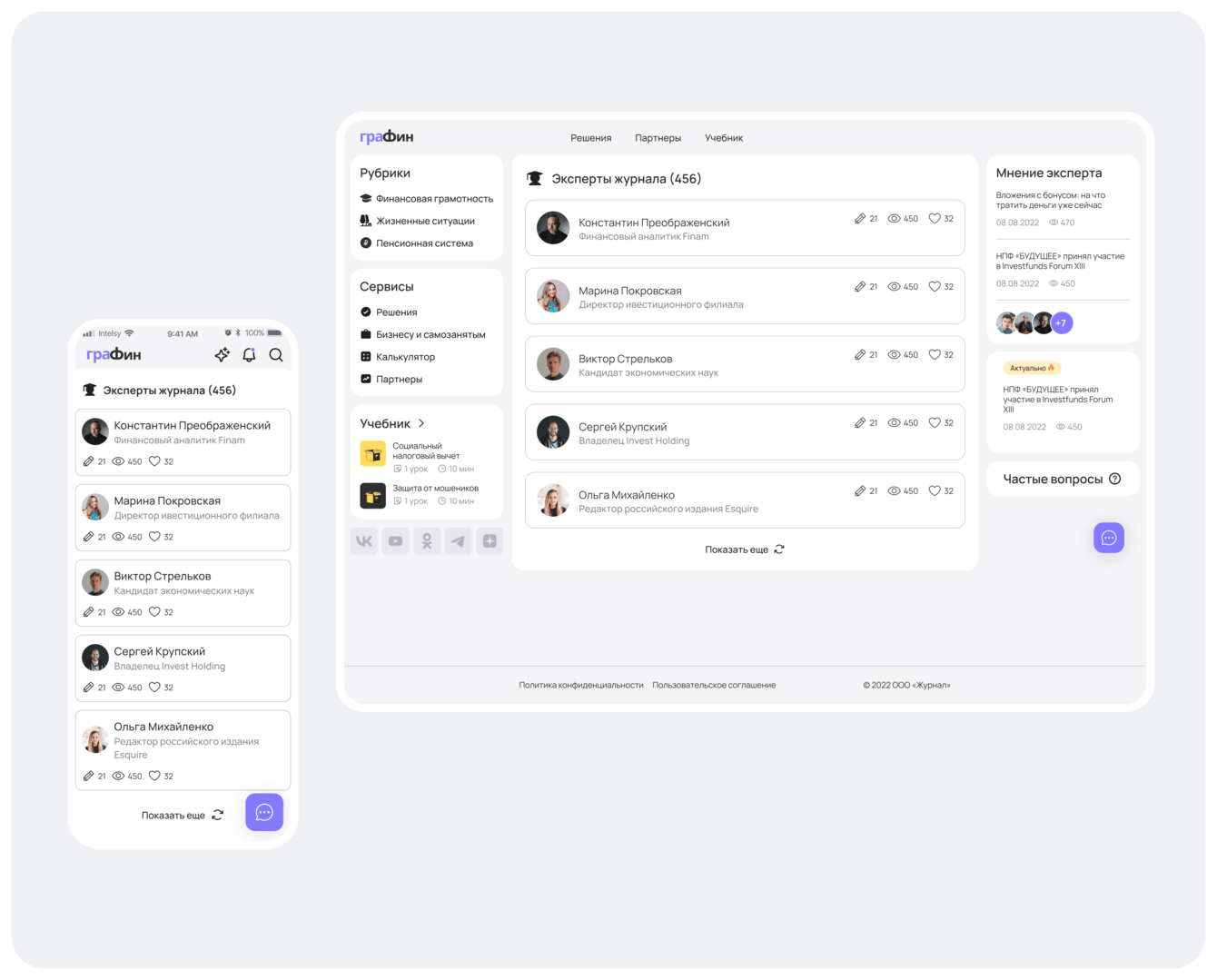 Контент для статей, квизов, тестов готовят эксперты в сфере долгосрочного инвестирования, каждый материал проходит строгий редакционный отбор. Все материалы добавляются через удобную CMS.