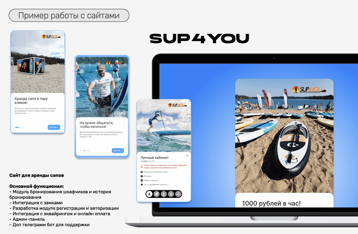 Доработка существующего функционала сайта и добавление нового - регистрация и авторизация, бронирование сапбордов по времени с учетом часовых поясов, интеграция с замками, админ-панель, тестирование и баг-фикс