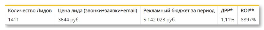 **ROI (рентабельность) - коэффициент окупаемости инвестиций. Показатель выше 100% означает, что вложенные средства окупаются. Данные по показателям ROI и ДРР рассчитаны на основе данных CRM исходя из суммы совершенных сделок по лидам пришедшим из контекстной рекламы.