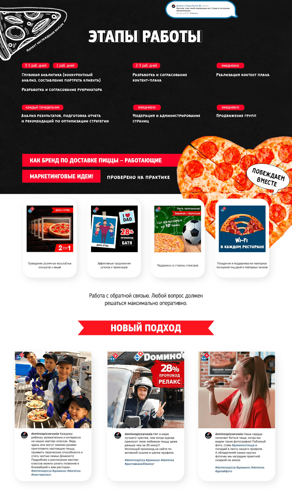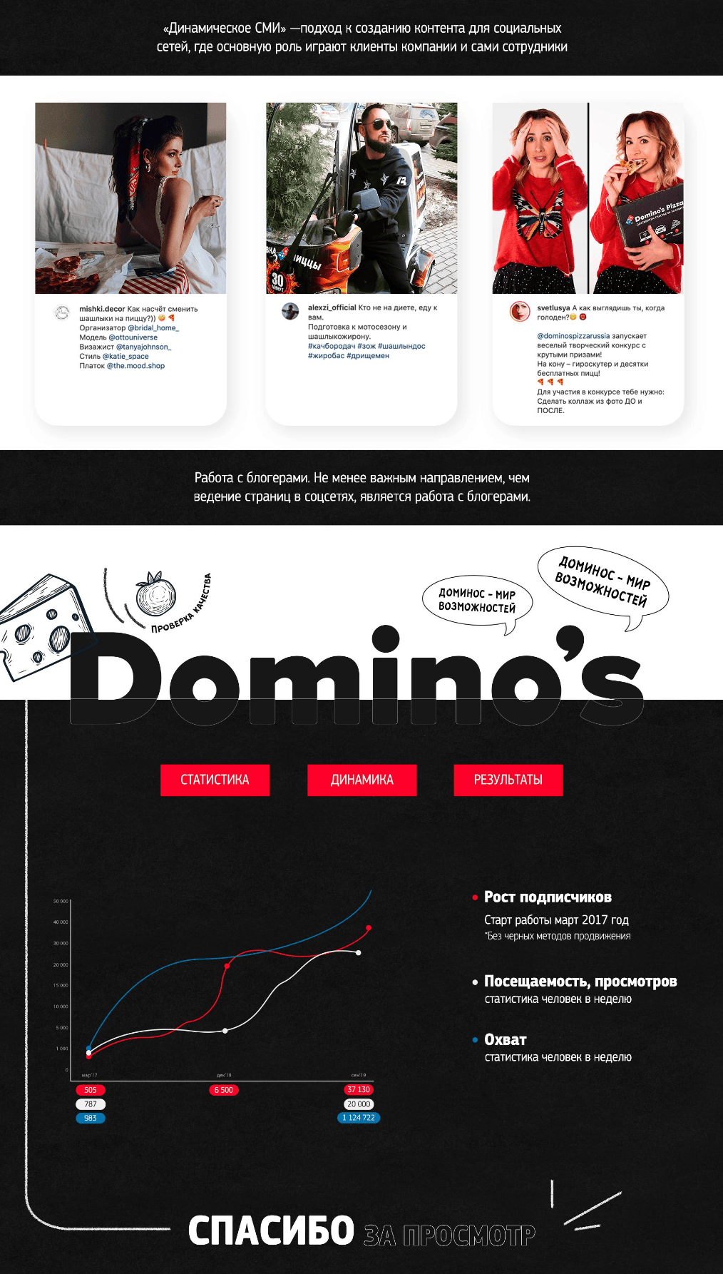 Было здорово помогать в продвижении социальных сетей компании Domino's Pizza в течение пяти лет. Вместе мы достигли больших успехов, увеличили число подписчиков и повысили уровень вовлечённости.