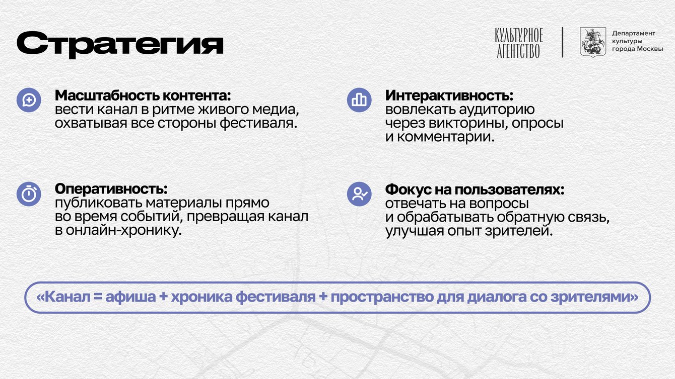 Преобразовать Telegram-канал фестиваля «Театральный бульвар» из сезонной афиши в постоянный культурный медиаресурс Москвы. Сделать так, чтобы канал не только информировал, но и вовлекал горожан в театральную жизнь города, помогал им ориентироваться в событиях и выстраивал прямой диалог со зрителем.