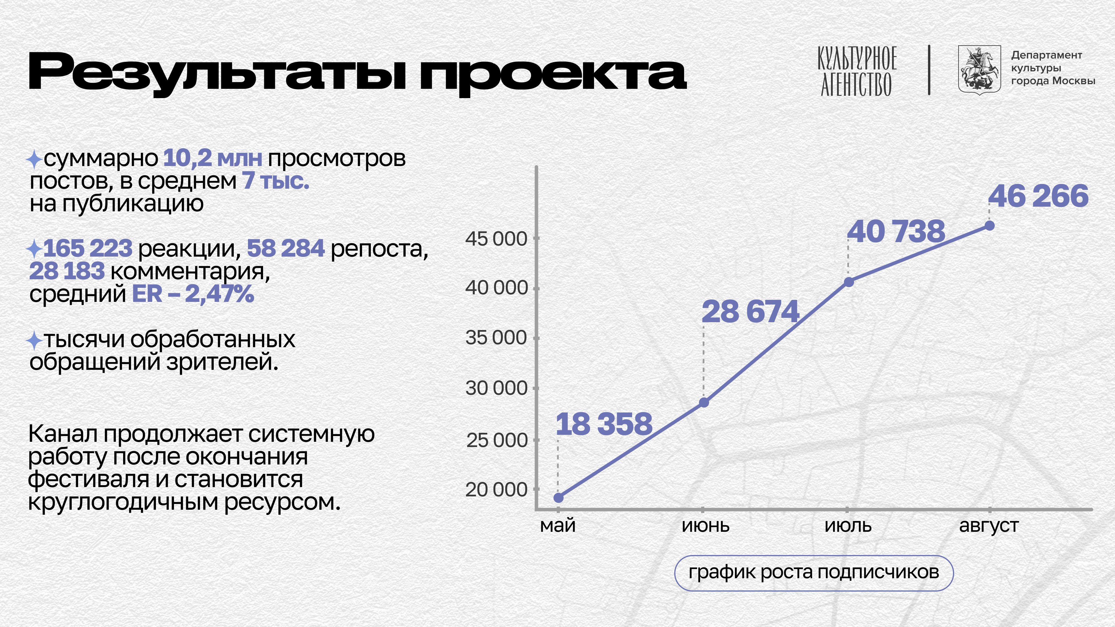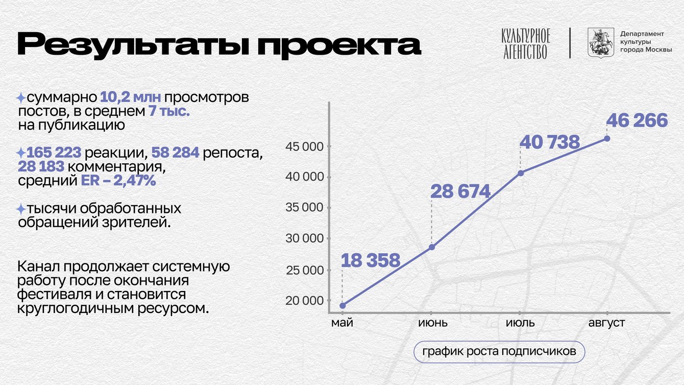 • Выпустили рекордный объём контента: 1 735 постов за 113 дней, включая тексты, афиши, закулисье и интервью с артистами.