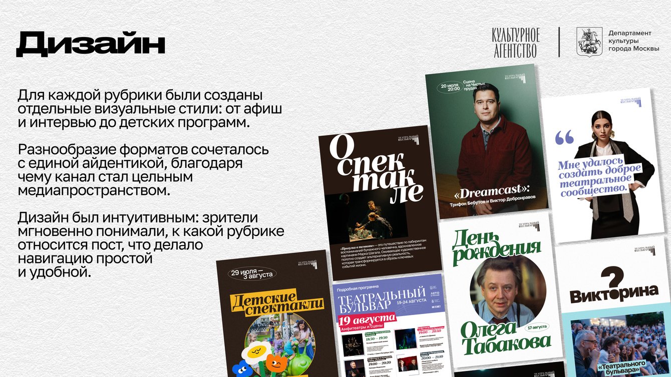 Канал был перестроен по принципу полноценного медиа. Мы разработали визуальную айдентику, систему рубрик и структуру контента, которая объединяла афиши, интервью, закулисье, обзоры площадок, интерактивы и видеоконтент.