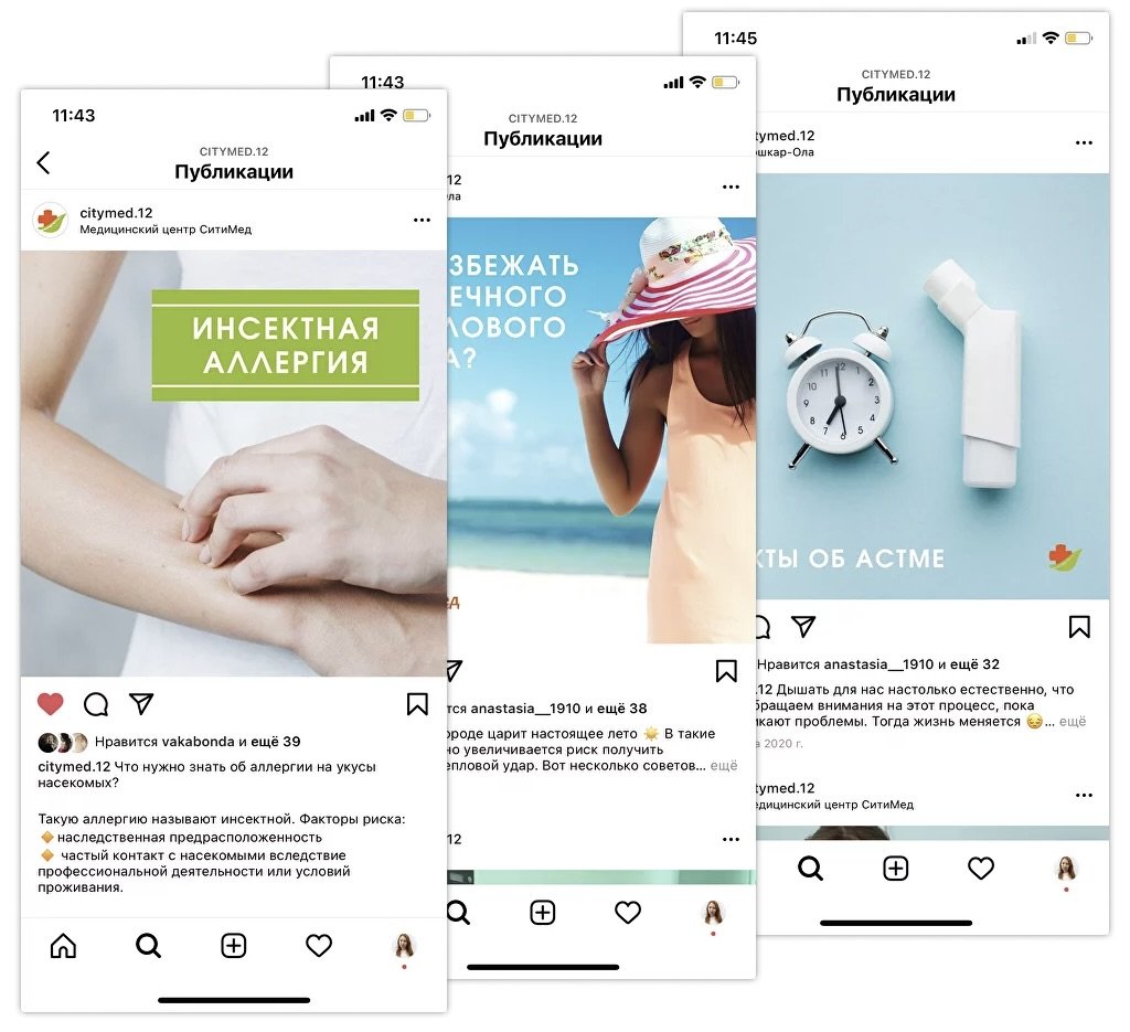 Также мы заметили, что важно соблюдать сезонность контента. Летом побольше рассказывать о возможности сделать справки в детсад, осенью — про профилактику простуд, в гололед — про травмы, во время цветения растений — про аллергию. И наоборот, кислотные пилинги не будут актуальны летом, как и медосмотры в школу зимой.