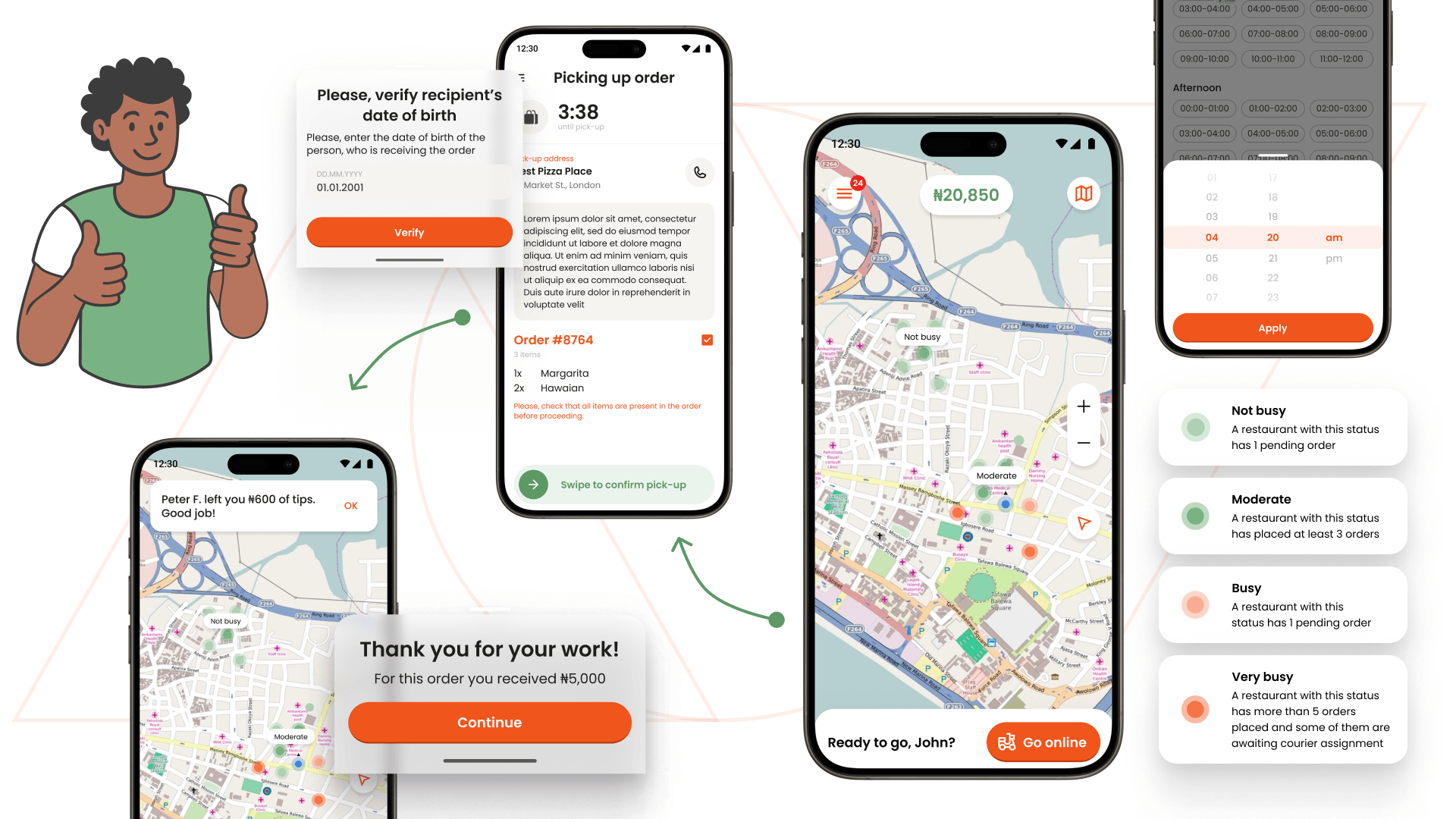 Сейчас мы разрабатываем личный кабинет, в котором курьеры смогут пройти регистрацию, выбрать зоны доставки, принимать заказы и управлять своими маршрутами.