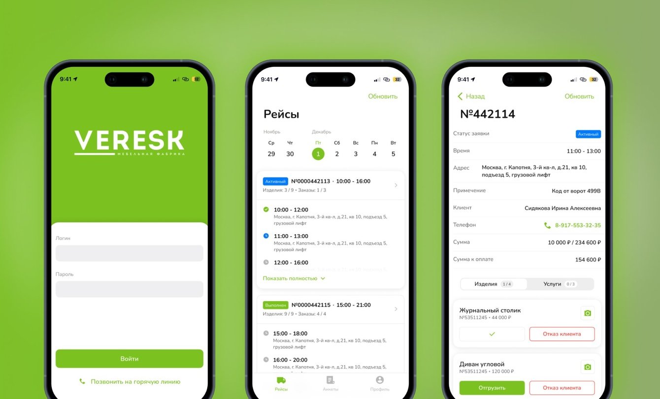 Разработать решение для экспедиторов мебельной фабрики, в задачи которого будет контроль качества доставки мебели, формирование наилучшего пути доставки и возможность принять оплату за доставку и мебель онлайн.