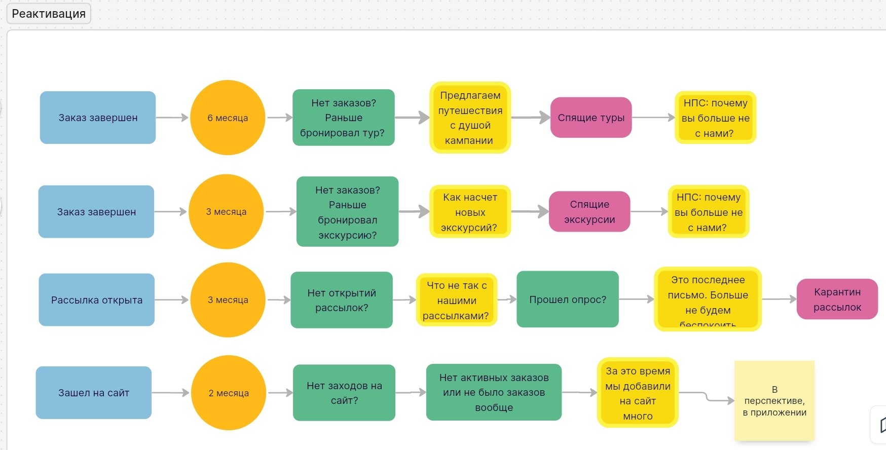 В сценарии «Реактивация» мы периодически будем касаться неактивного клиента в автоматизированном режиме, не затрагивая менеджеров. И если снова появится потребность в путешествии, он, возможно, вспомнит о компании.