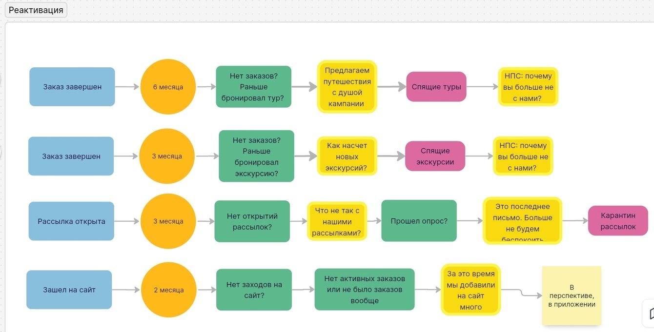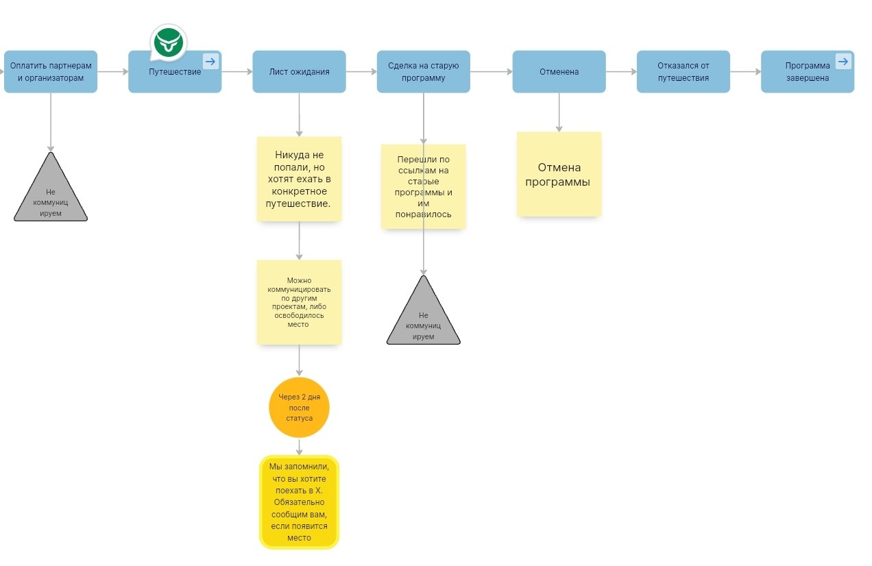 Если человек просто посмотрел, но пока не готов купить путешествие, мы продолжаем отправлять ему коммуникации. Показываем фотографии с путешествий. Рассказываем, как будет проходить путешествие, кто будет находиться рядом, показываем отзывы клиентов, подробно описываем маршрут. Закрываем возражения про безопасность и стоимость. Так карта коммуникаций охватывает весь путь пользователя в зависимости от его действий или бездействий.