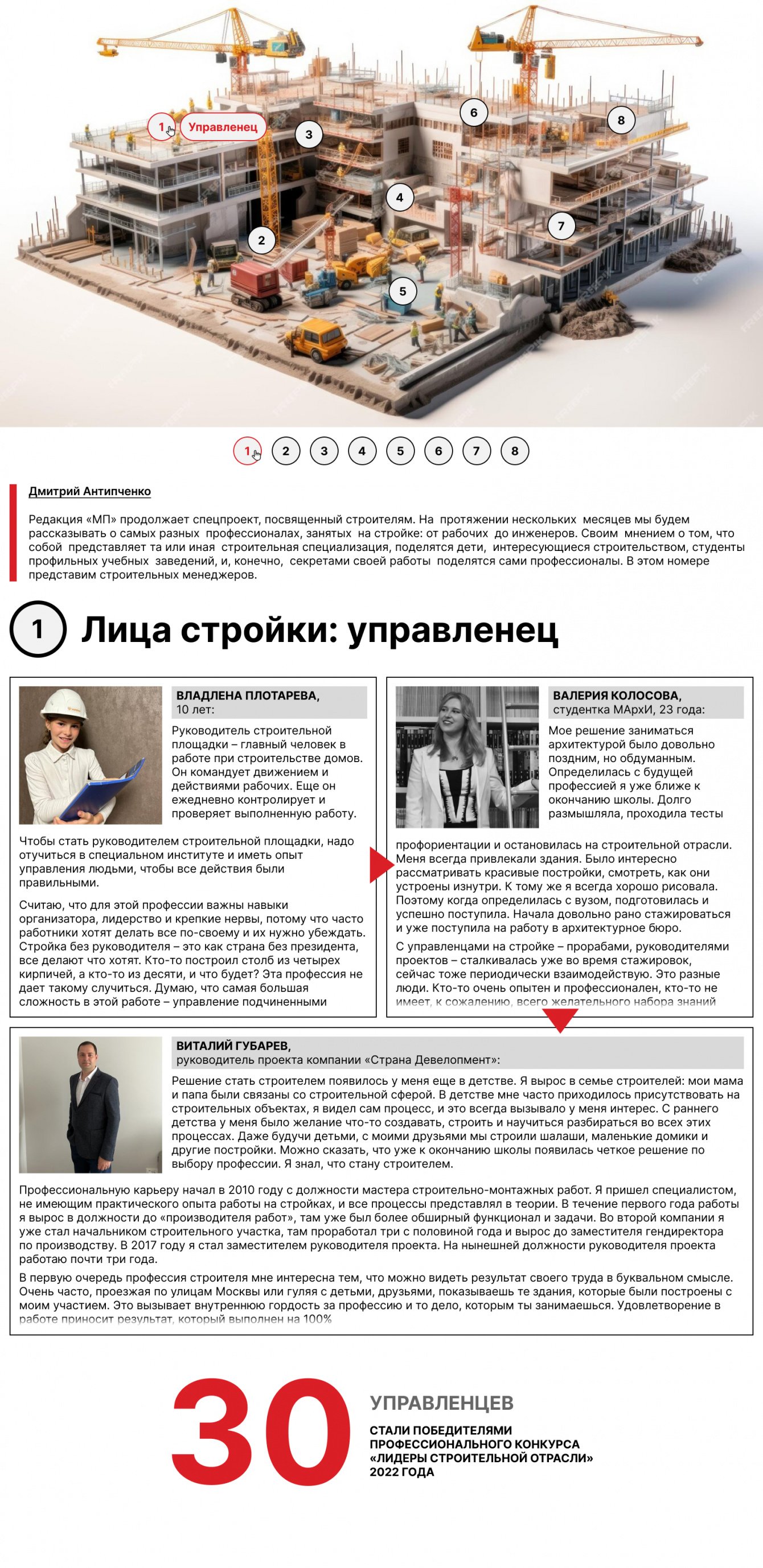Редакция «МП» с нашей помощью представила спецпроект, посвященный строителям. Он повествует о самых разных профессионалах, занятых на стройке: от рабочих до инженеров. Своим мнением о том, что собой представляет та или иная строительная специализация, поделились интересующиеся строительством дети и студенты профильных учебных заведений. И, конечно, профессионалы своего дела - они рассказали много интересного о своих обязанностях и поделились секретами успешной работы.