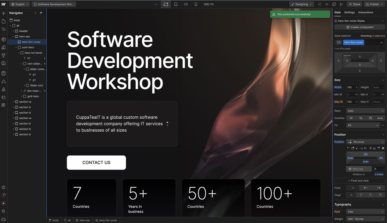 Верстка Webflow-сайта для международной софтверной компании по макету заказчика и добавление некоторых анимаций, визуальных эффектов.