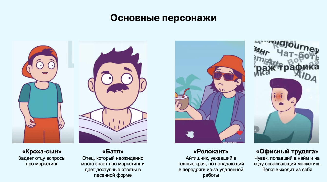 Целевая аудитория мультов: молодые digital-специалисты и маркетологи. Среди них много релокантов, а также офисных работников. Для них есть «жизненные» мульты, обыгрывающие разные тренды маркетинга (например, нейросети) или рабочие ситуации.