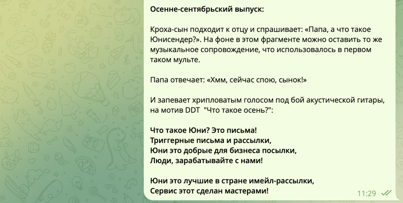 Пригласили знакомого саунд-продюсера, который в одиночку озвучил всех персонажей (Папу, Кроху-сына, Релоканта и т.д.) и написал несколько песенок. Одну из них («Что такое Юни?» мы положили на мотив бессмертного хита «Что такое осень?».