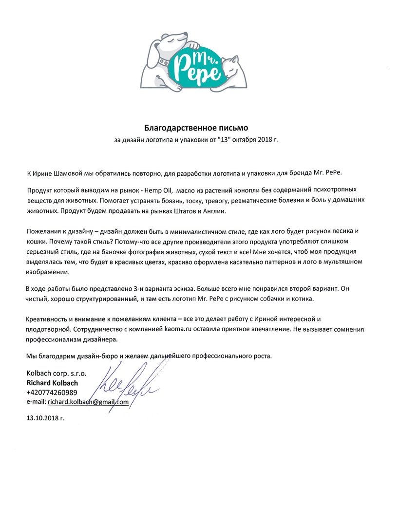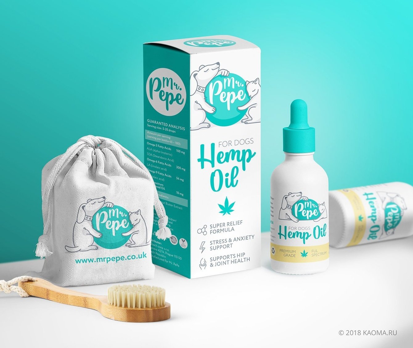 К Ирине Шамовой мы обратились повторно, для разработки логотипа и упаковки для бренда Mr. PePe. Продукт который выводим на рынок - Hemp Oil, масло из растений конопли без содержания психотропных веществ для животных.