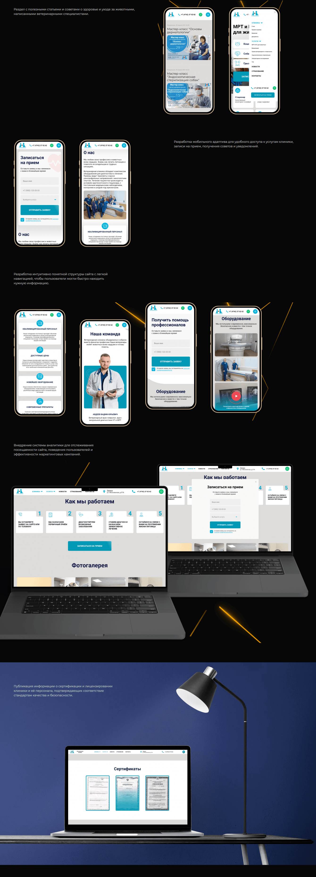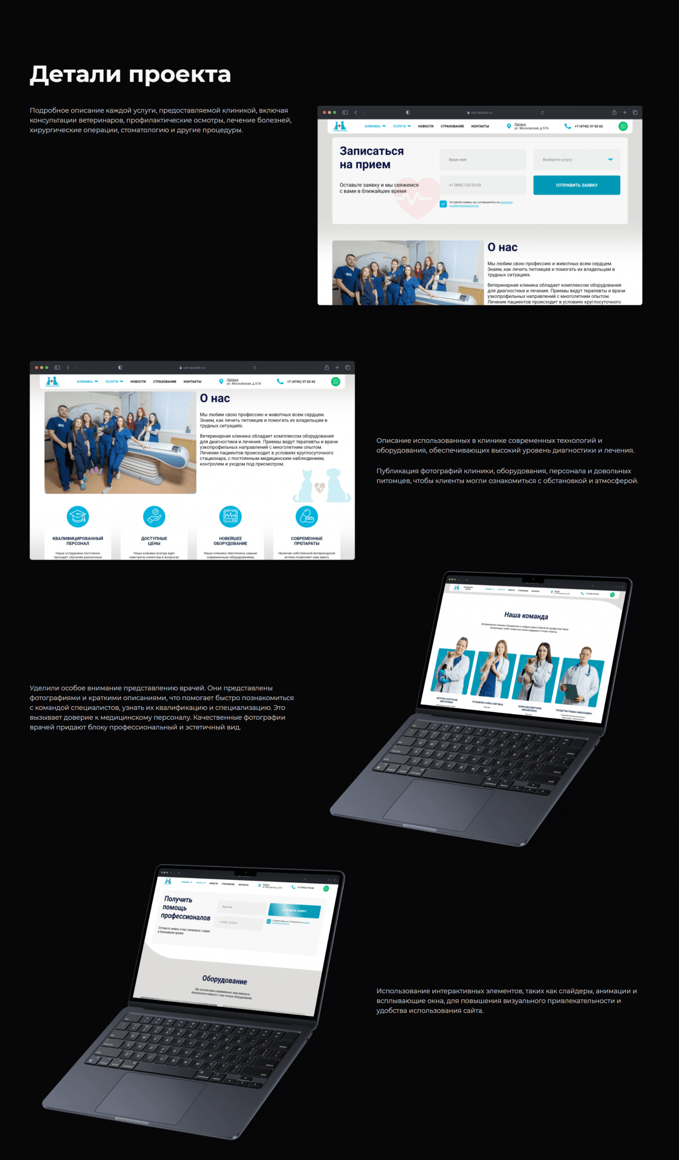 В результате работы студии разработки сайтов, был создан уникальный веб-портал, который представляет ветеринарную клинику «Ветеринарный лазарет» как надежного партнера в заботе о здоровье домашних питомцев. Сайт обеспечит удобный доступ к информации о клинике, услугах и специалистах, а также станет платформой для взаимодействия с клиентами и получения обратной связи.