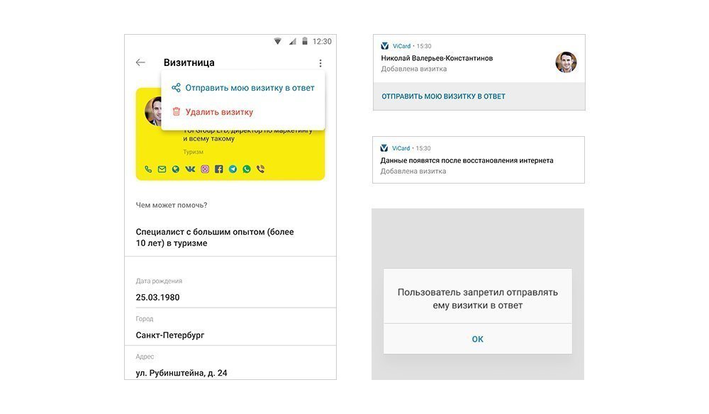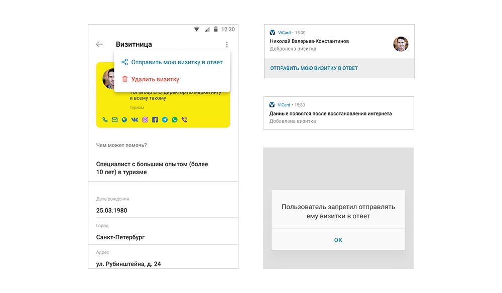 Если пользователь получил входящую визитку, то передать этому контакту свою можно даже еще быстрее, чем по NFC: с помощью кнопки “Отправить визитку в ответ”. В этом случае информация передается через сервер.