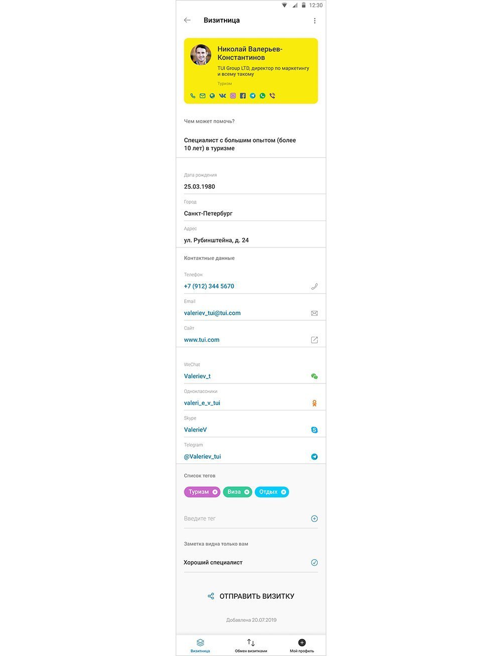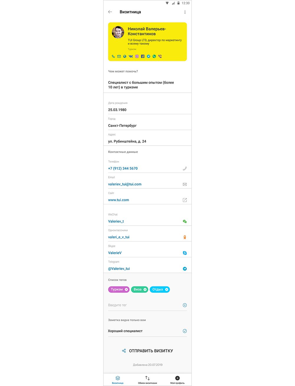 При клике на визитку открывается полная информация: контактные данные, сфера деятельности, ссылки на соц. сети и мессенджеры — все, чтобы понять, чем занимается человек и как с ним связаться. Можно добавить свой комментарий — он виден только вам, и задать теги для удобного поиска.
