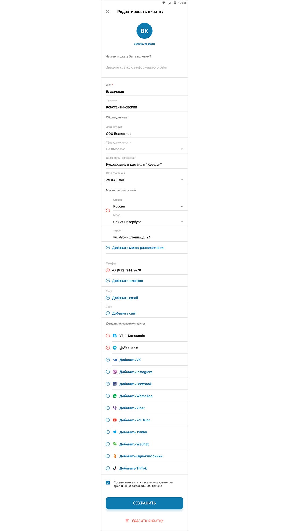 Для того чтобы передать визитку, ее нужно сначала создать. Обязательным является только имя, остальные поля заполняются по желанию. Это сделано для того, чтобы создать и передать свою карточку можно было менее, чем за 1 минуту.