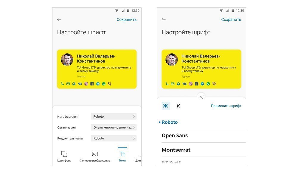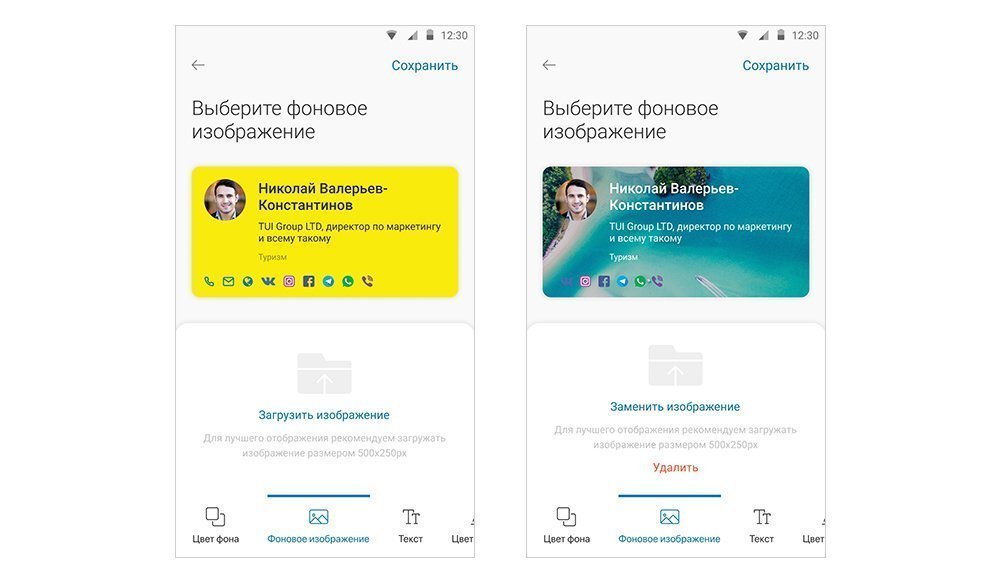 Чтобы выделить свою карточку в Визитнице других пользователей, или сохранить свой фирменный стиль для электронной визитки, можно изменить ее внешний вид. Возможности дизайна отображаются внизу экрана. При клике на раздел, открываются его настройки. Все изменения в режиме реального времени применяются к визитке и отображаются выше.
