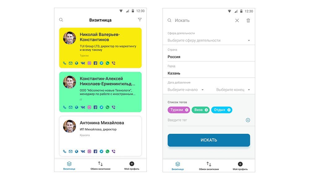 Сразу после регистрации можно получать визитки других людей, они хранятся в Визитнице. Дизайн виртуальной визитки повторяет внешний вид реальной бумажной: прямоугольный блок с минимальной информацией о человеке.