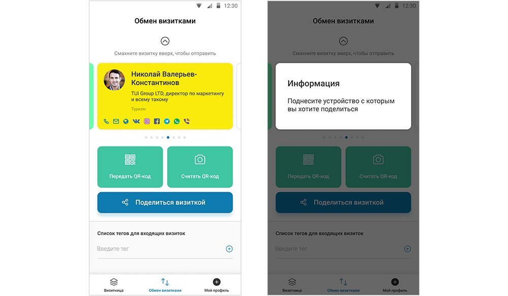 Если оба устройства (которое передает и которое принимает визитку) поддерживают NFC, то отправить визитку можно бесконтактным способом. Для этого нужно лишь поднести смартфоны друг к другу и “свайпнуть” визитку наверх.
