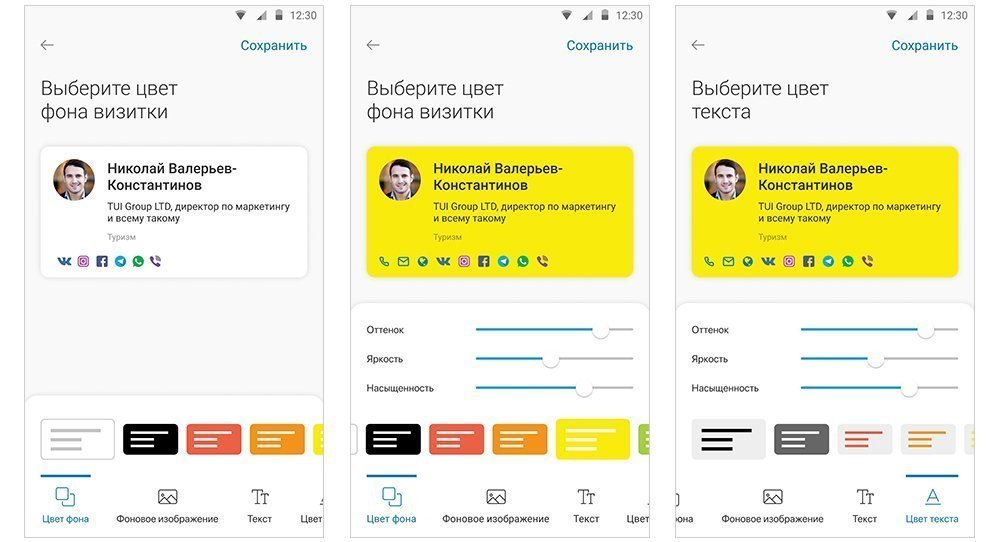 Можно изменить цвет фона и текста, с помощью ползунков менять их яркость, насыщенность и оттенок. Вместо цвета фона можно использовать изображение: загруженная картинка растянется на весь размер визитки.