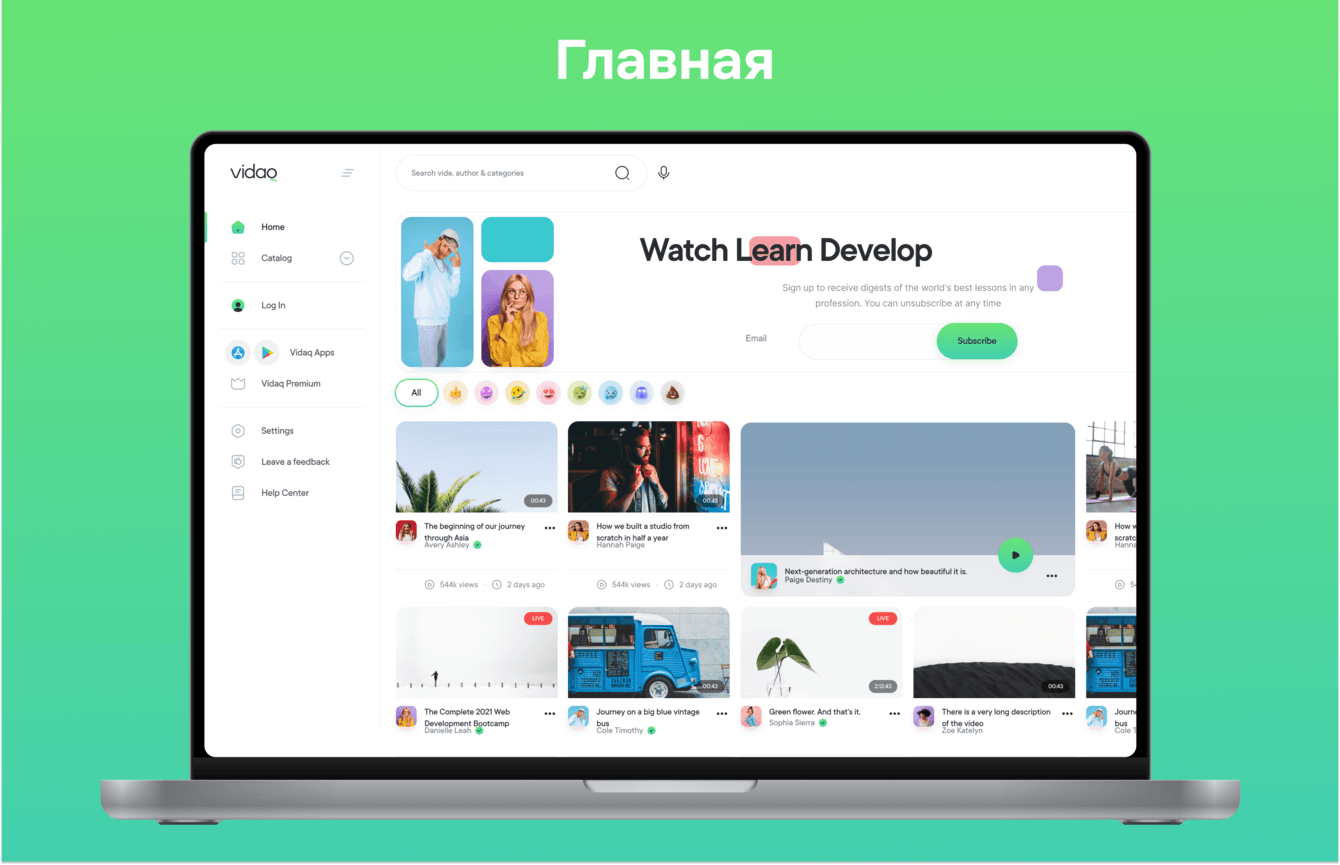 Совместно со студией Sick разработать интерфейс для зарубежного видеохостинга Vidaq. Главной идеей проекта является обучение и подача специализированной информации от специалистов — специалистам.