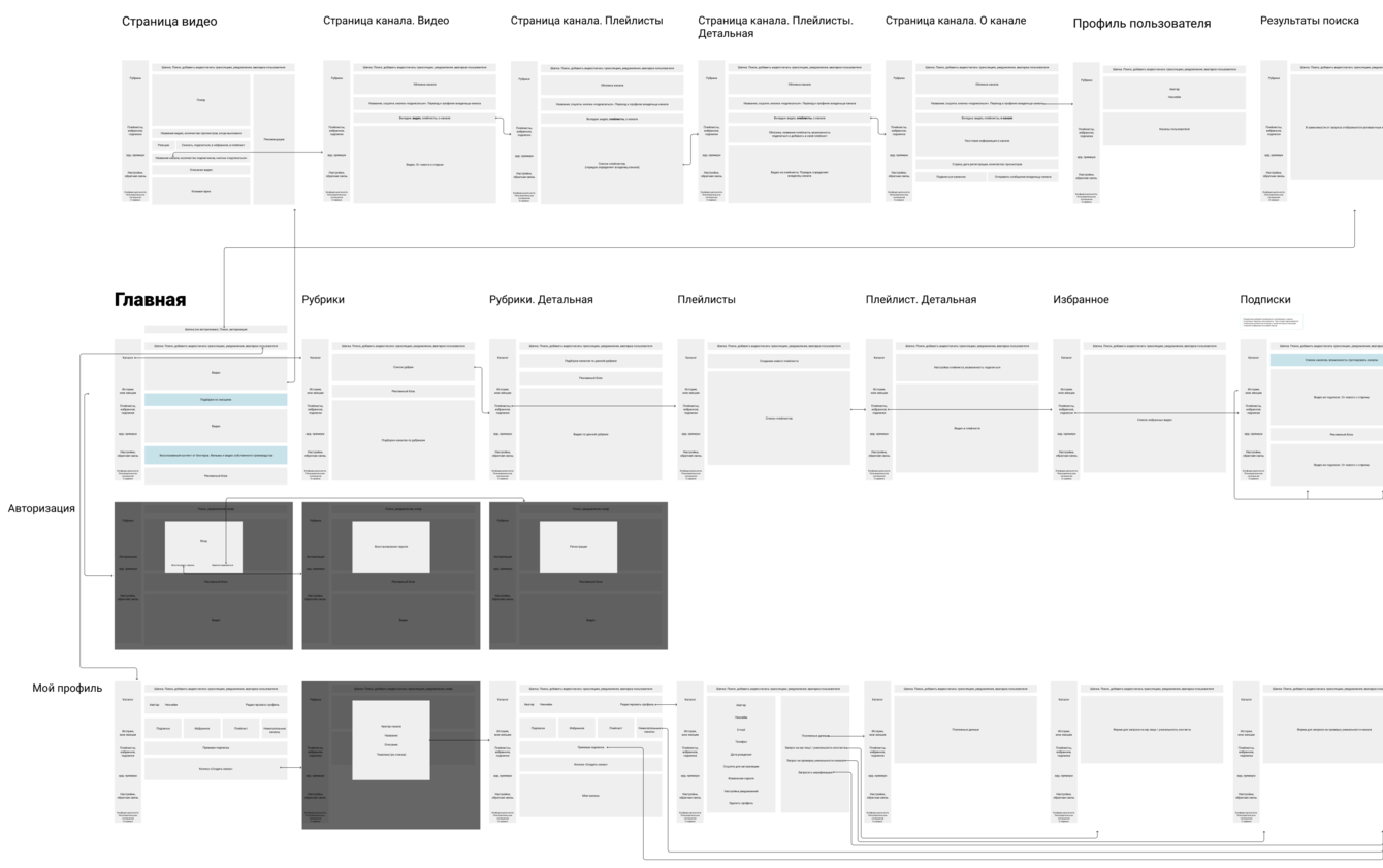 Проанализировали последовательность действий потенциального пользователя видеохостинга и на основе этого создали детальный User Flow. Постарались разобрать все сценарии от первого касания с сайтом до реакции на конкретное видео автора.