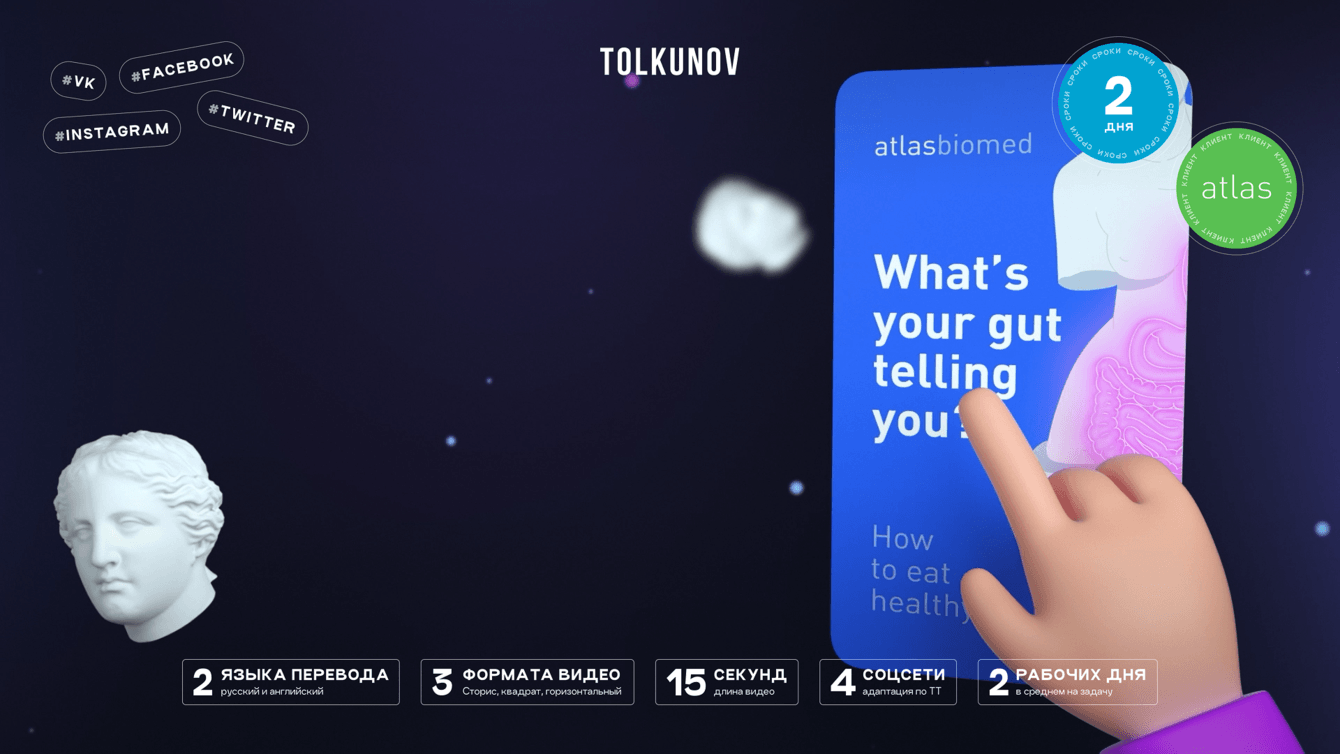 Подготовили 15-секундные MP4-ролика 3 форматов: сторис, квадрат и горизонтальный русском и английском языках. Адаптировали их под требования 4 соцсетей: VK, Twitter, Instagram*, Facebook* (*принадлежат компании Meta, признанной экстремистской организацией и деятельность которой запрещена на территории РФ).