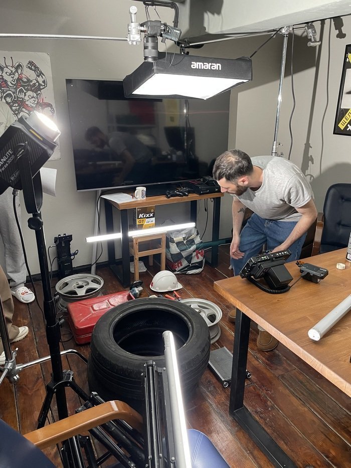 Локацию «в гараже» мы снимали сверху вниз, где пол стал имитацией стены. Лаковое покрытие и грамотная обстановка помогли это сделать на ура и передать все, как надо. Здесь нужен был специфический реквизит, который не найдешь в обычном офисе, поэтому канистры, диски и покрышки мы принесли из наших гаражей.