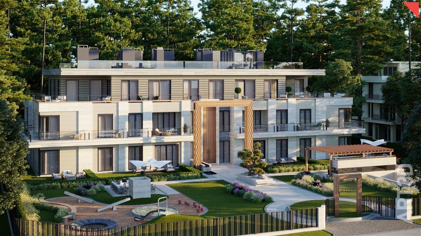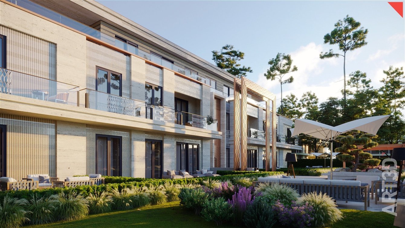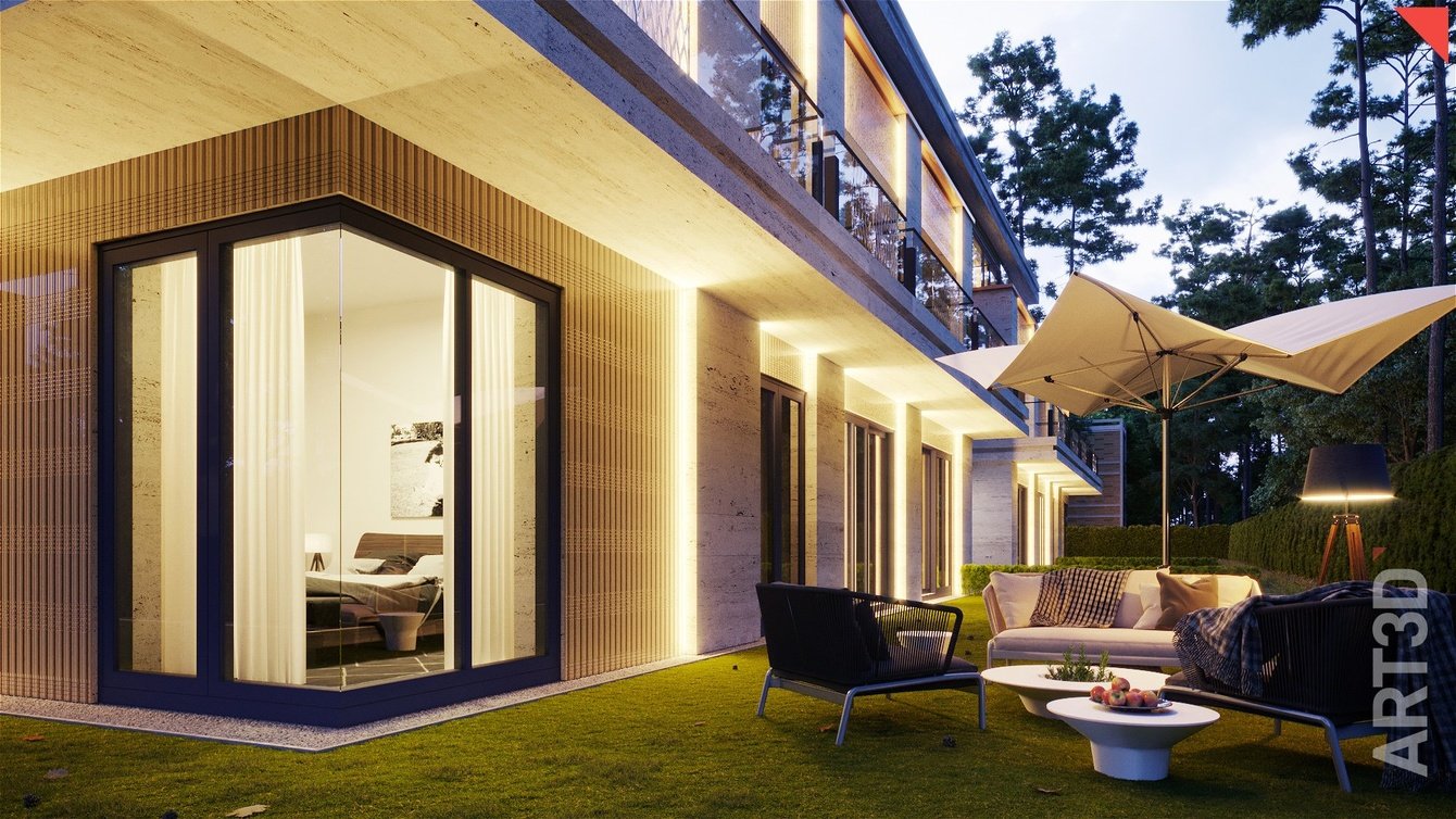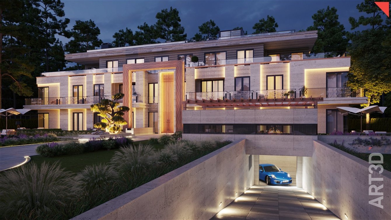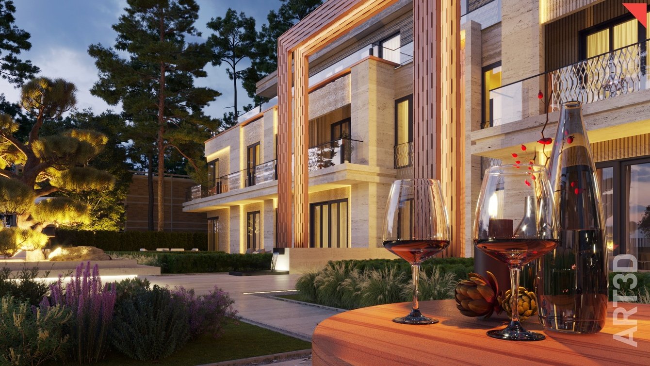 В 3D-визуализациях и анимации команда ART3D постаралась предедать атмосферу проекта и его детали: бегущая вода у входа в дом, здание, созданное из камня – молодого мрамора, уличный камин , цветущие растения, олицетворяющие радость бытия, красоту и счастье и многое другое.