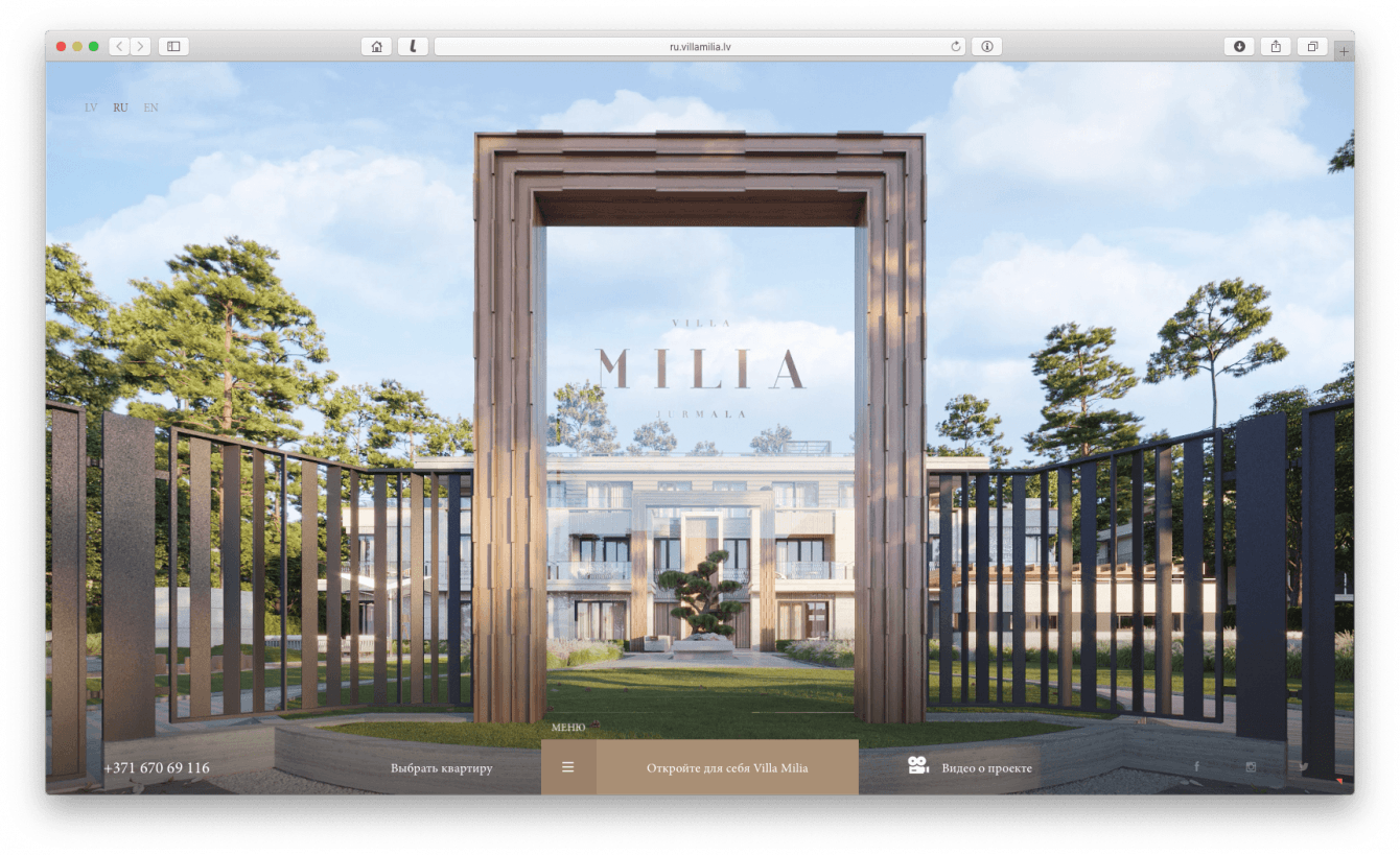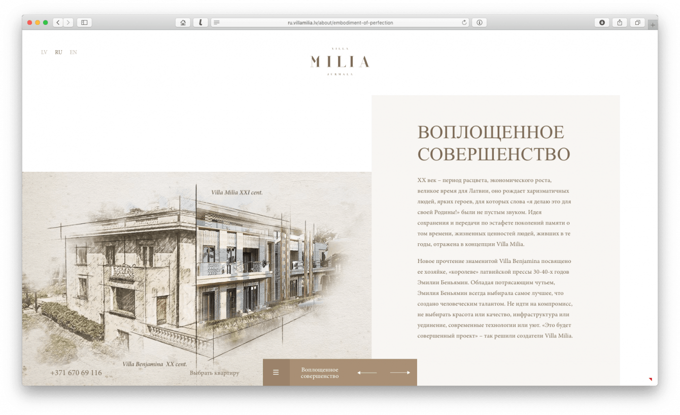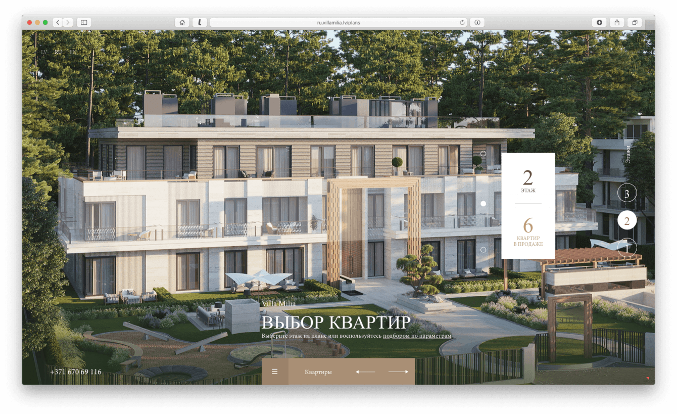 Сайт, разработанный для проекта, – лаконичен, но при этом наполнен всем необходимым для знакомства с объектом: история, технические параметры, выбор квартир, галереи, 3D-анимационный фильм о проекте, расположение и контакты.