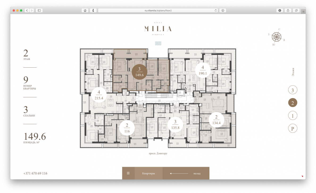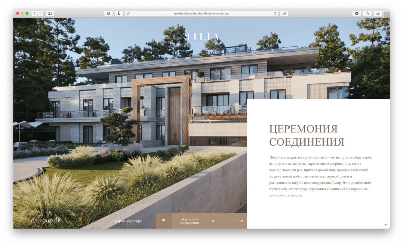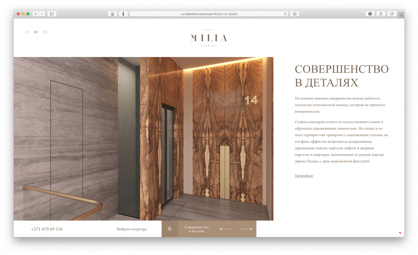 Сайт, разработанный для проекта, – лаконичен, но при этом наполнен всем необходимым для знакомства с объектом: история, технические параметры, выбор квартир, галереи, 3D-анимационный фильм о проекте, расположение и контакты.