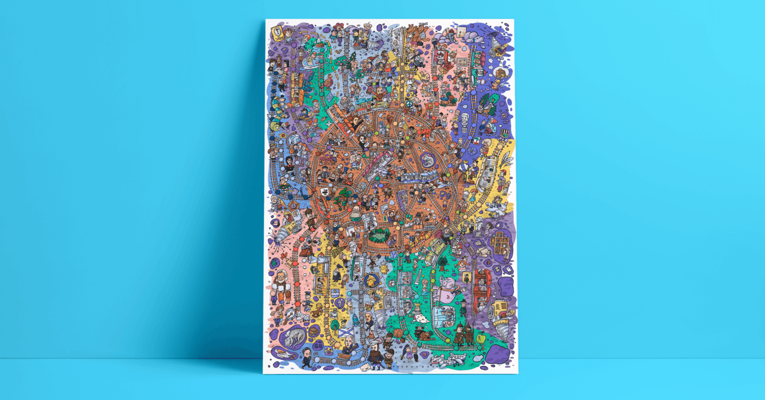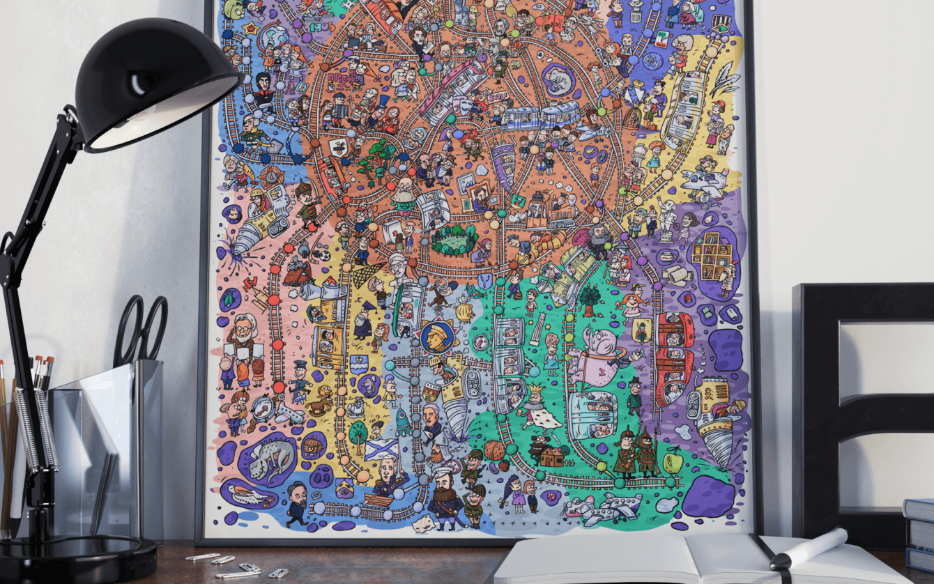 При создании иллюстраций мы подробно изучили историю каждой станции, а также объектов, людей и событий с ними связанными. Затем весь этот массив знаний воплотили в милые обаятельные иллюстрации и совместили их в единую карту!