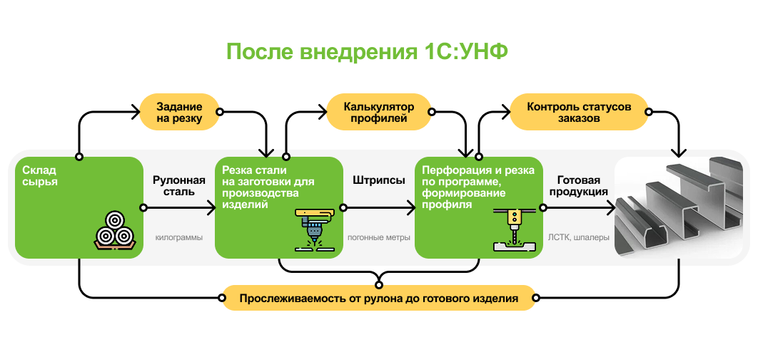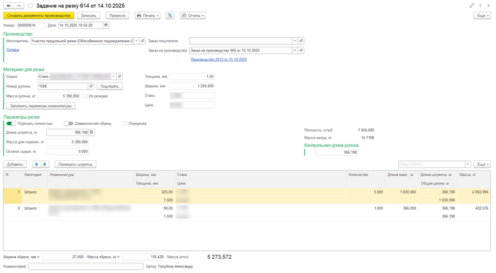 Основная сложность заключалась в пересчете единиц измерения: сырье поступает в килограммах, а готовая продукция выпускается в погонных метрах. Чтобы это решить, настроили, что пользователь задает только длину штрипса, которую необходимо отрезать от рулона, а остальное система делает сама.