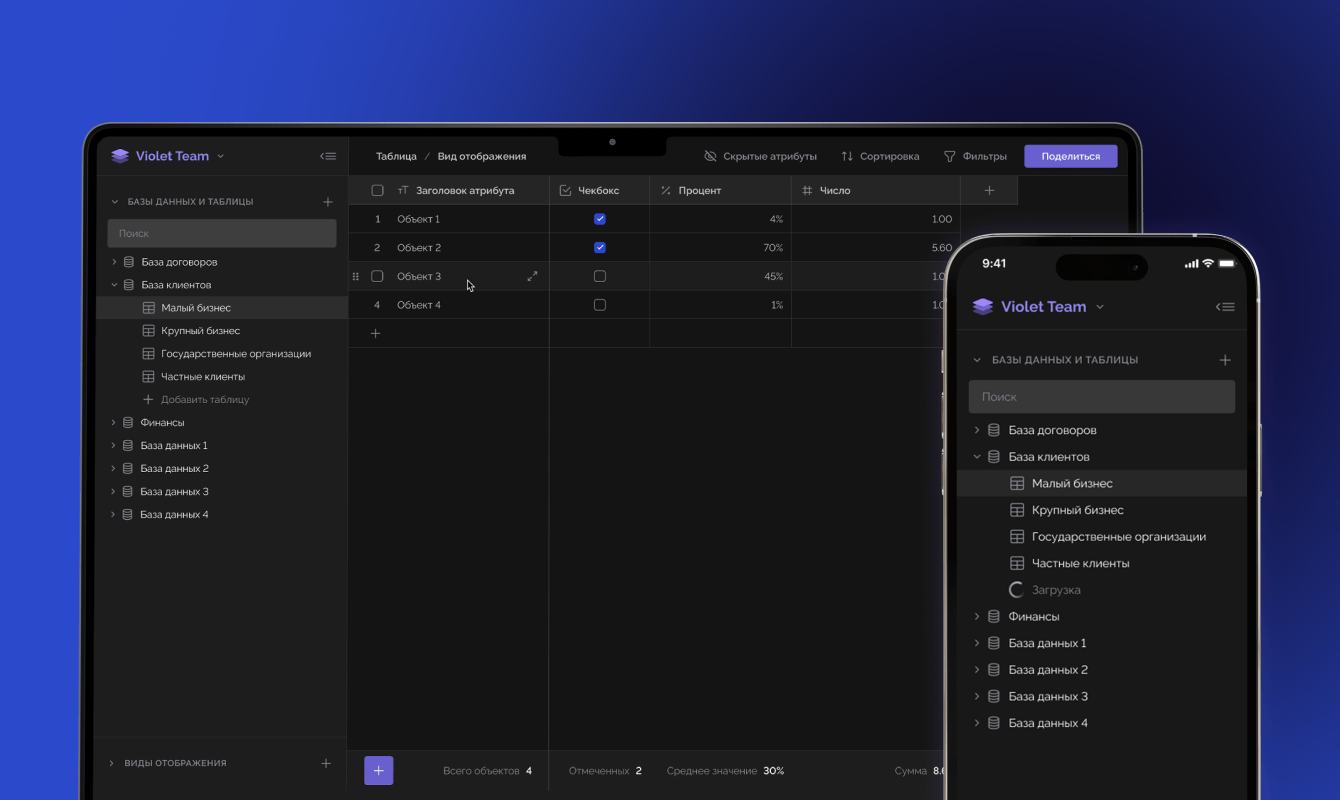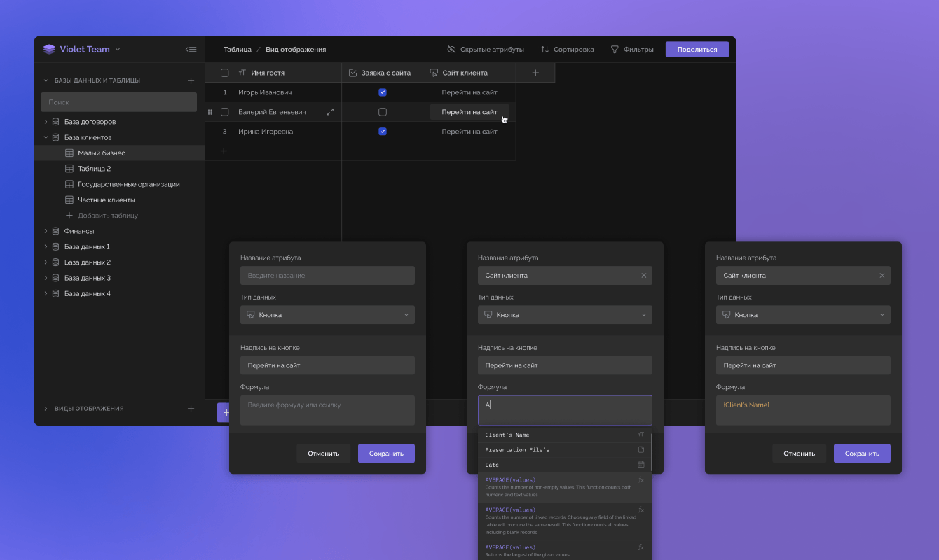Но Violet — это не простая электронная таблица. По итогу работы пользователь получает структурированную базу данных, которая будет хранится на серверах его организации, может интегрироваться с другими информационными системами и защищает структуру данных.