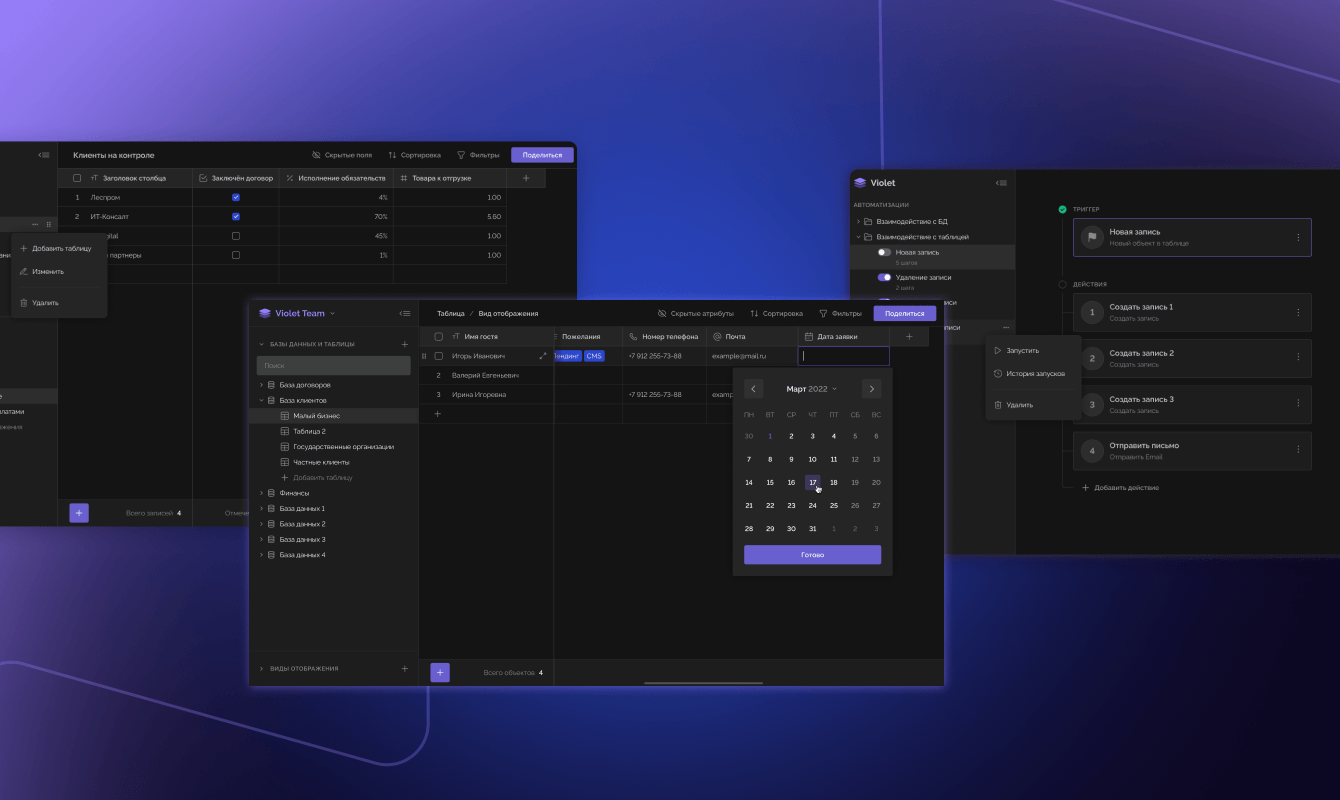 Violet позволяет быстро автоматизировать операции. Процесс прост: пользователь выбирает событие, которое запускает автоматизацию, и настраивает последовательность шагов (постановка задачи ответственным, уведомление руководителей, автоматическое изменение статусов).