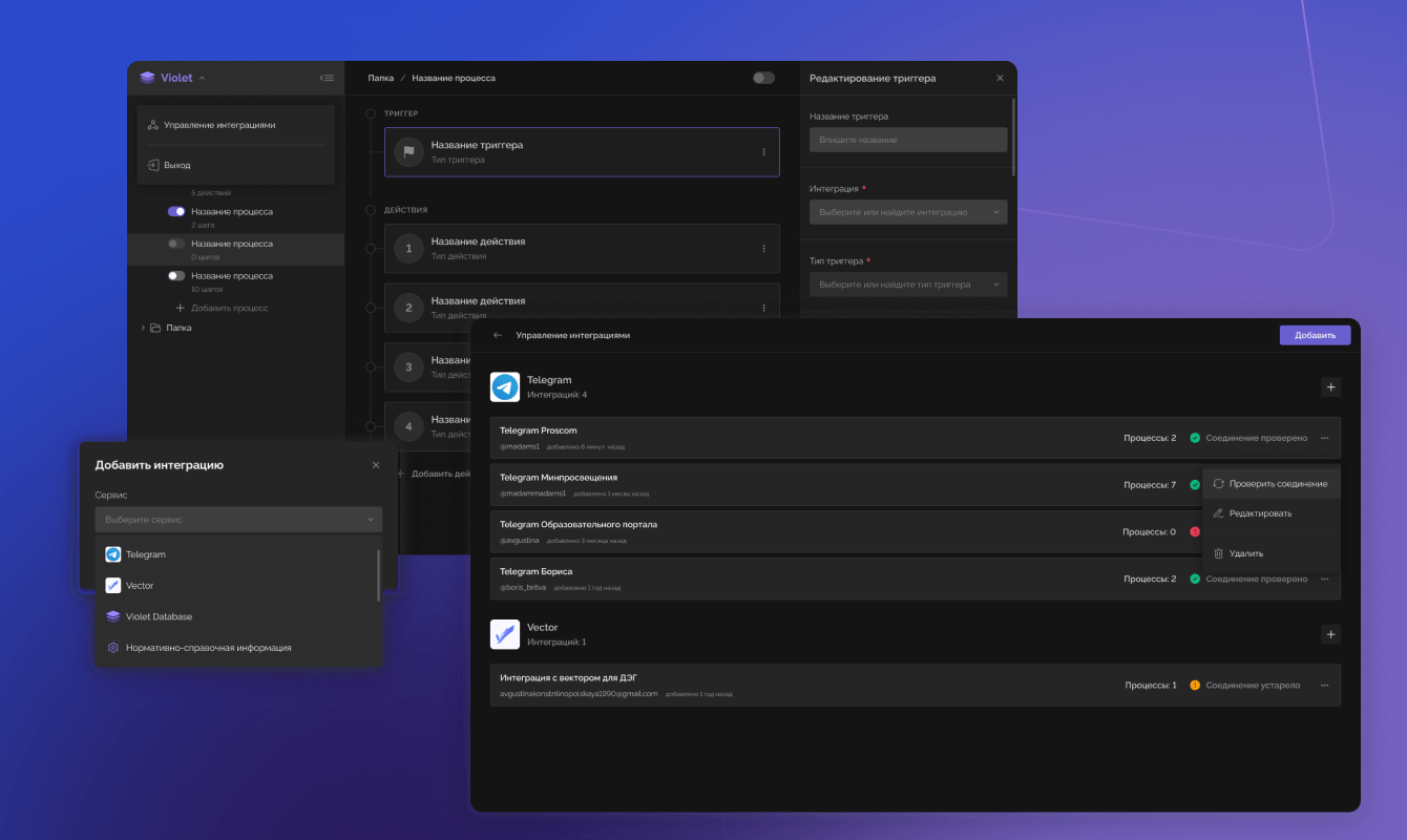 Сервисы, созданные с помощью Violet, легко интегрируются с другими информационными системами и платформами организаций — благодаря системе настраиваемых динамических API.