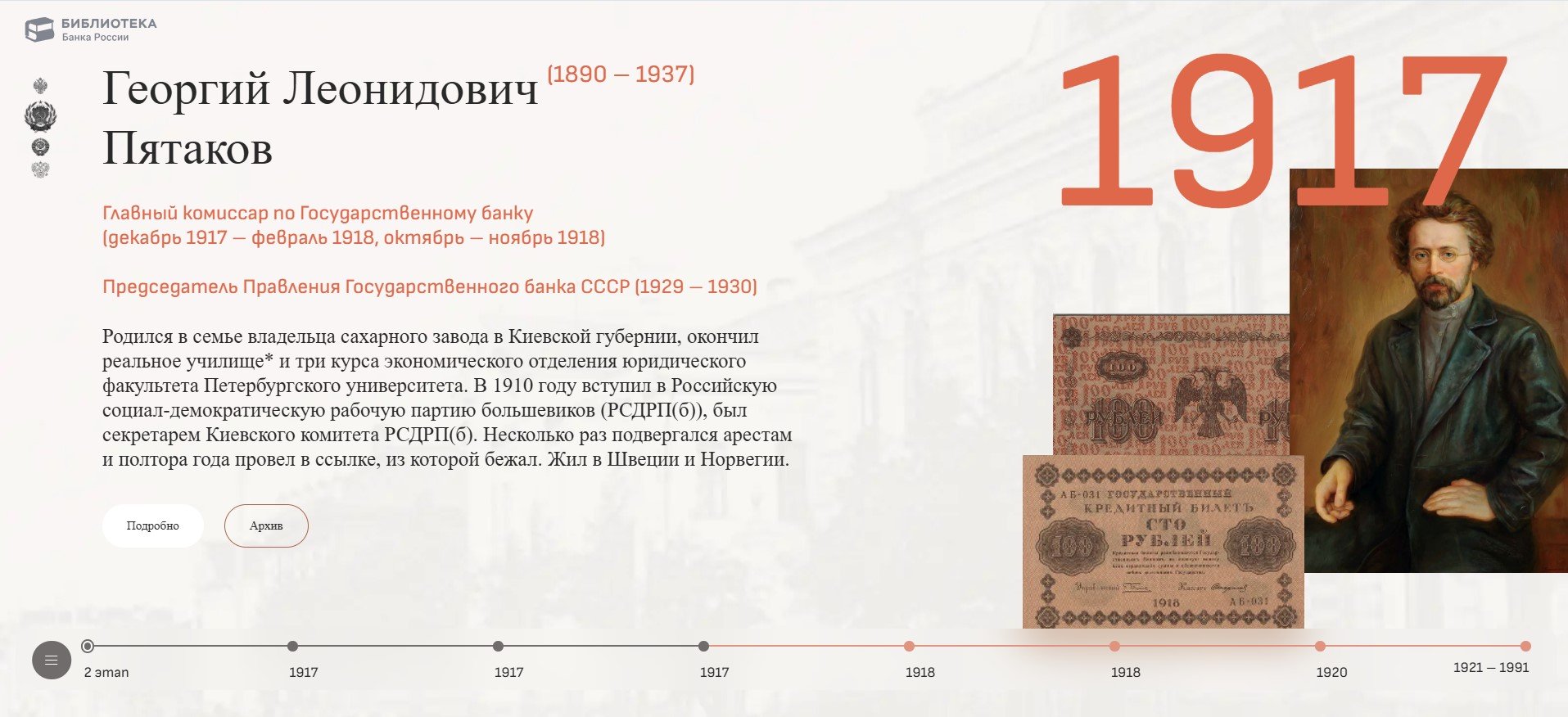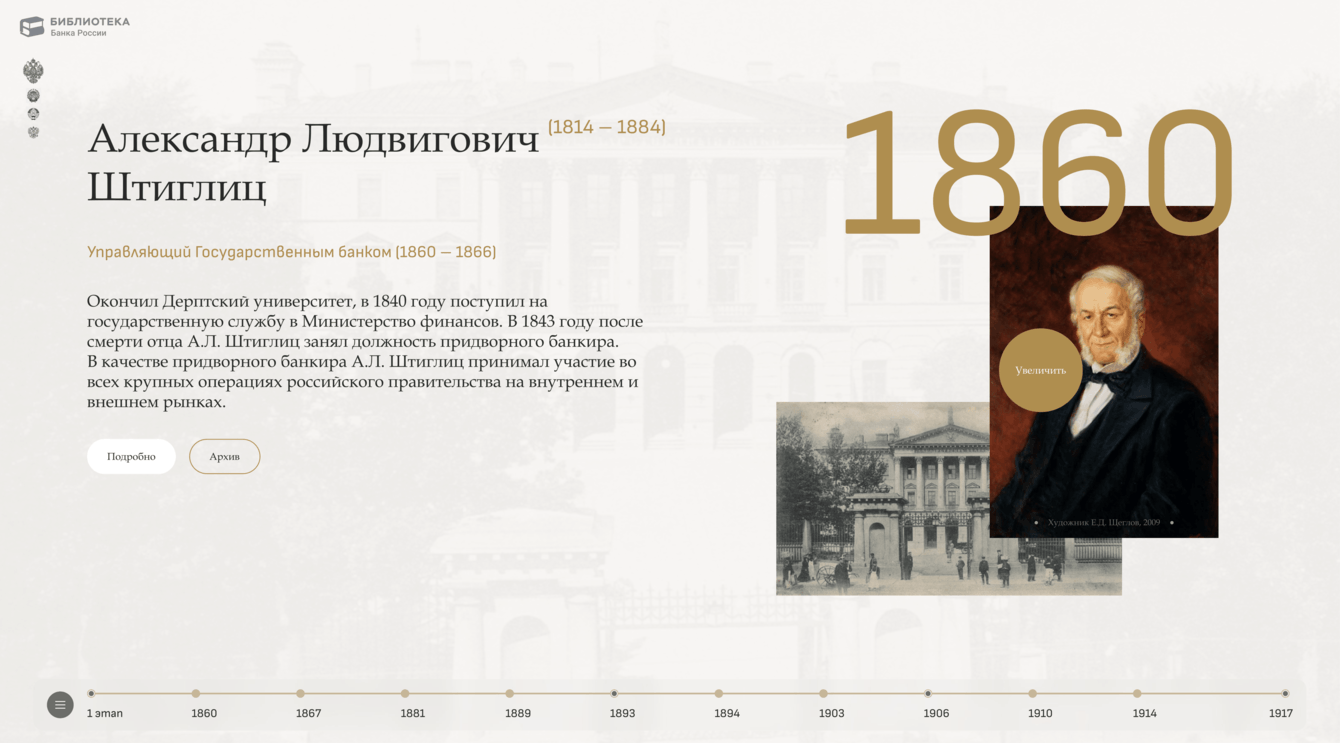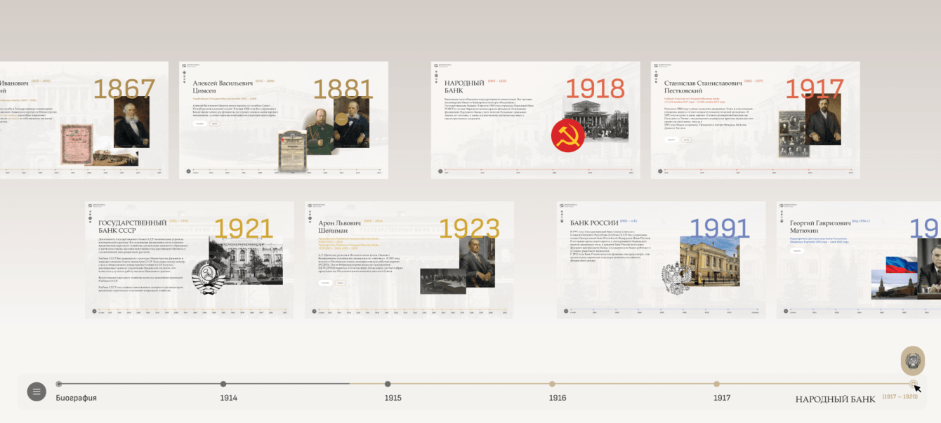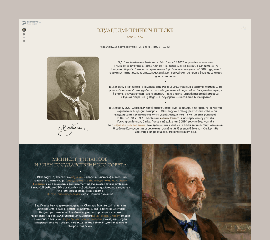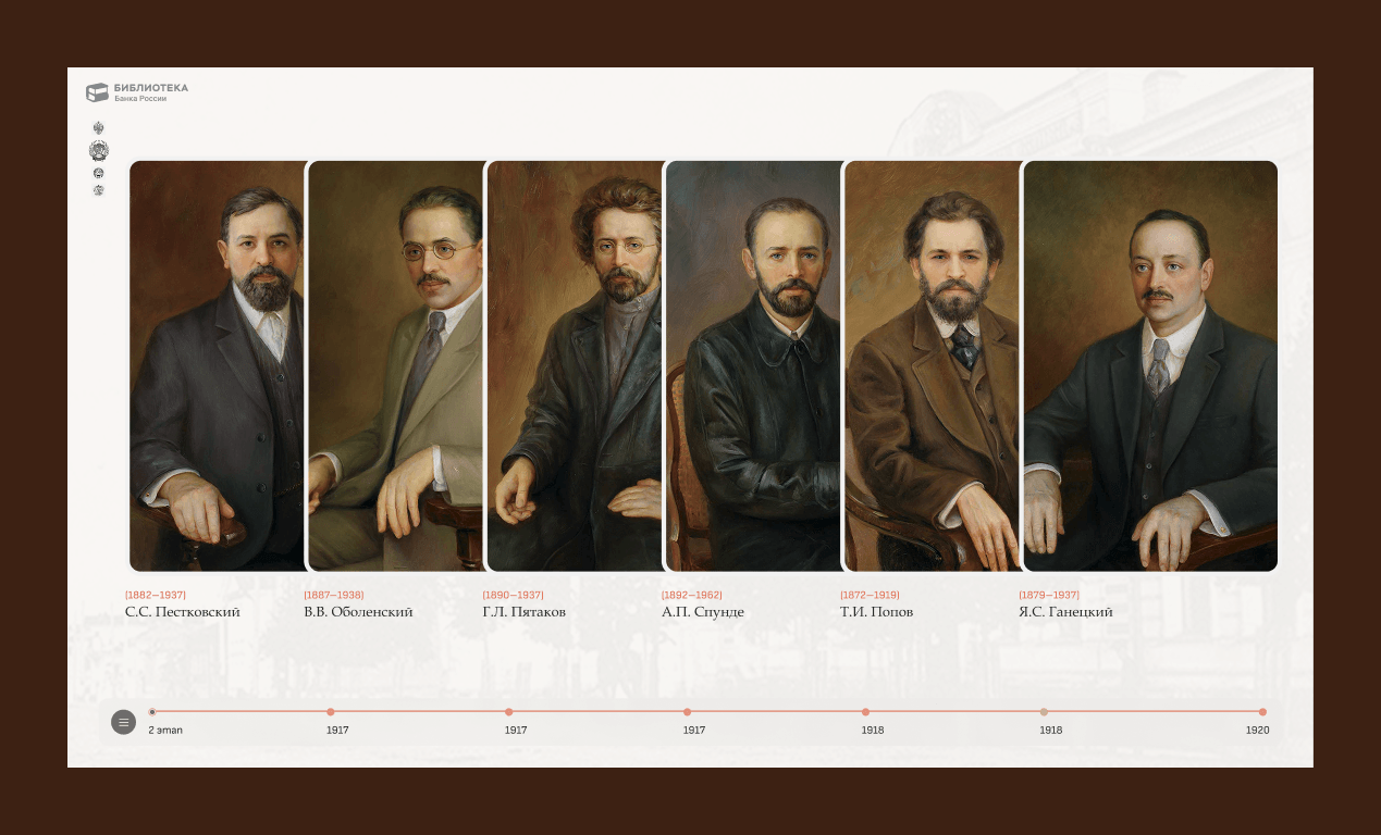 Требовалось создать интерактивную виртуальную выставку к 165-летию Банка России на базе проекта «Библиотека Банка России», которая рассказывает историю банка от его основания до наших дней через биографии его председателей.