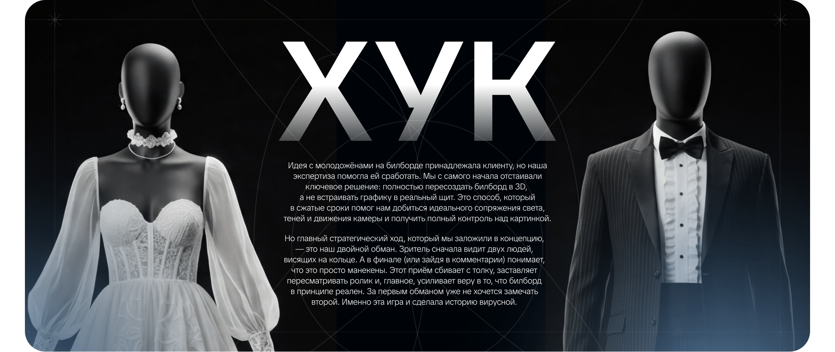 Наша идея: Во-первых, мы берём узнаваемую московскую локацию, которая часто мелькает не только перед местными, но и перед теми, кто живёт за пределами Москвы. А ещё создаём не просто фейковый вирусный ролик, а фейк внутри фейка. Жених с невестой окажутся, при ближайшем рассмотрении, манекенами. Делаем установку на максимальный реализм: съёмка на айфон, актёры в кадре, два разных ракурса - будто бы от разных очевидцев - и невероятная проработка каждой графической детали.