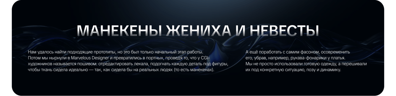 Симуляция ткани: После того как одежда идеально села, мы настроили физику ткани: подобрали параметры жёсткости, веса, трения, направление и силу ветра. Главная задача была — добиться естественного развевания.