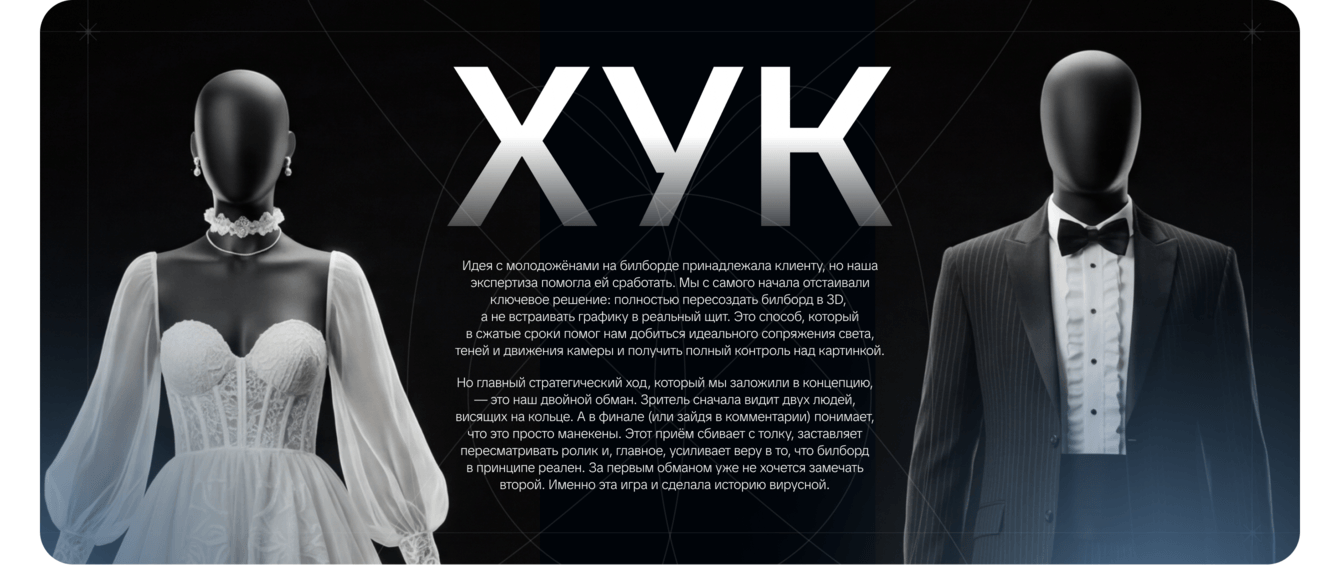 Июнь 2025 года. Свадебный сезон в разгаре, и ювелирный бренд Sunlight готовит мощную промо-акцию, посвящённую обручальным кольцам. Рынок переполнен: конкуренты заливают ленты стандартными баннерами с романтичными парами и целующимися голубями. В этом розовом сиропе бренду просто необходимо сломать шаблон и создать инфоповод, который заставит говорить о Sunlight. И они приходят к нам с предложением: с помощью компьютерной графики сделать ролик о том, как в Москве на билборде с обручальным кольцом повисли жених с невестой.