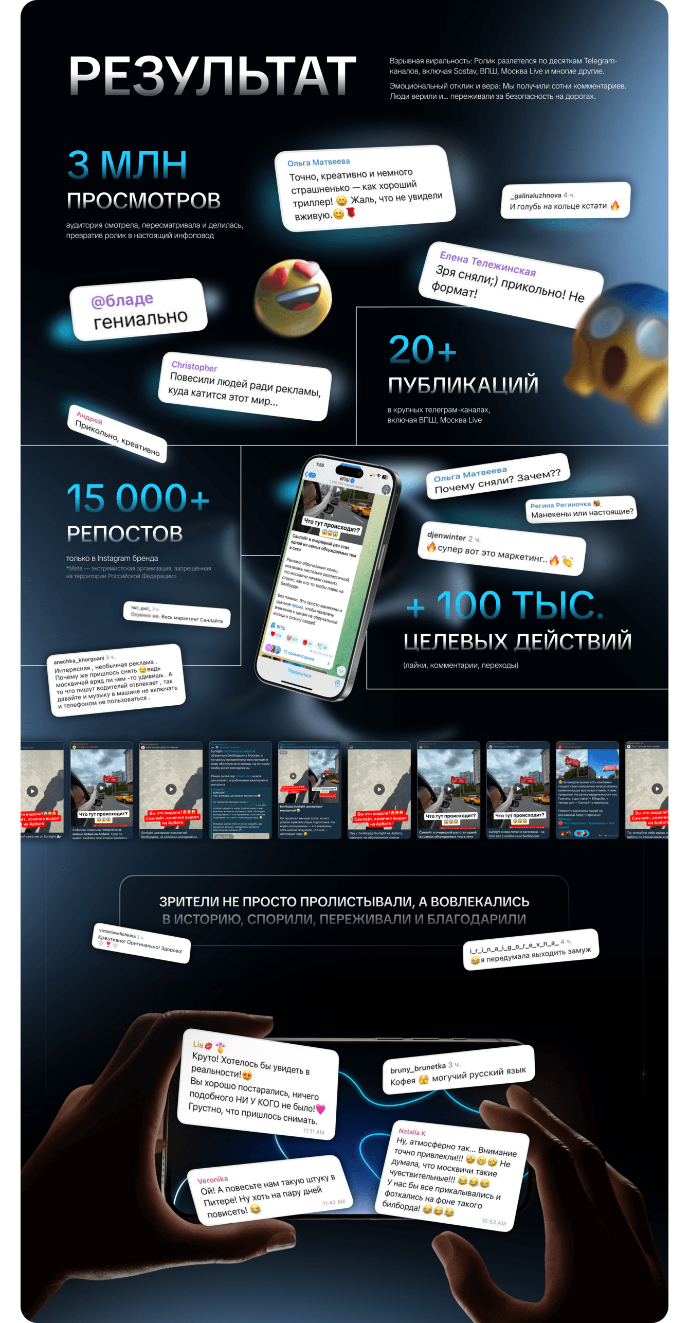 В Lagom мы начали свой путь с вирусных роликов. Нам всегда нравилось смотреть и изучать реакцию людей на них. Будь то ролик с мангалом на дворце бракосочетания в Казани вместо большого чана или огромная качающаяся неваляшка возле ГЭС в Москве. Некоторые зрители даже специально ездили на локации, чтобы посмотреть все эти креативы вживую, и ничего там не обнаружив, страстно писали об этом в комментариях... В ролике для Санлайт нам удалось сделать фейк в фейке и даже специалисты из других агентств сомневались в том, графика это или нет. Колыхание одежды, разные ракурсы, естественная озвучка, реалистичная графика заставляли пересматривать видео снова и снова подписчиков каналов, разгоняя их бурное обсуждение в комментариях о том "ПРАВДА ЭТО ИЛИ НЕТ?" Цель была выполнена. Зрители рады эффектному видео, клиент и наша команда рады результатам.