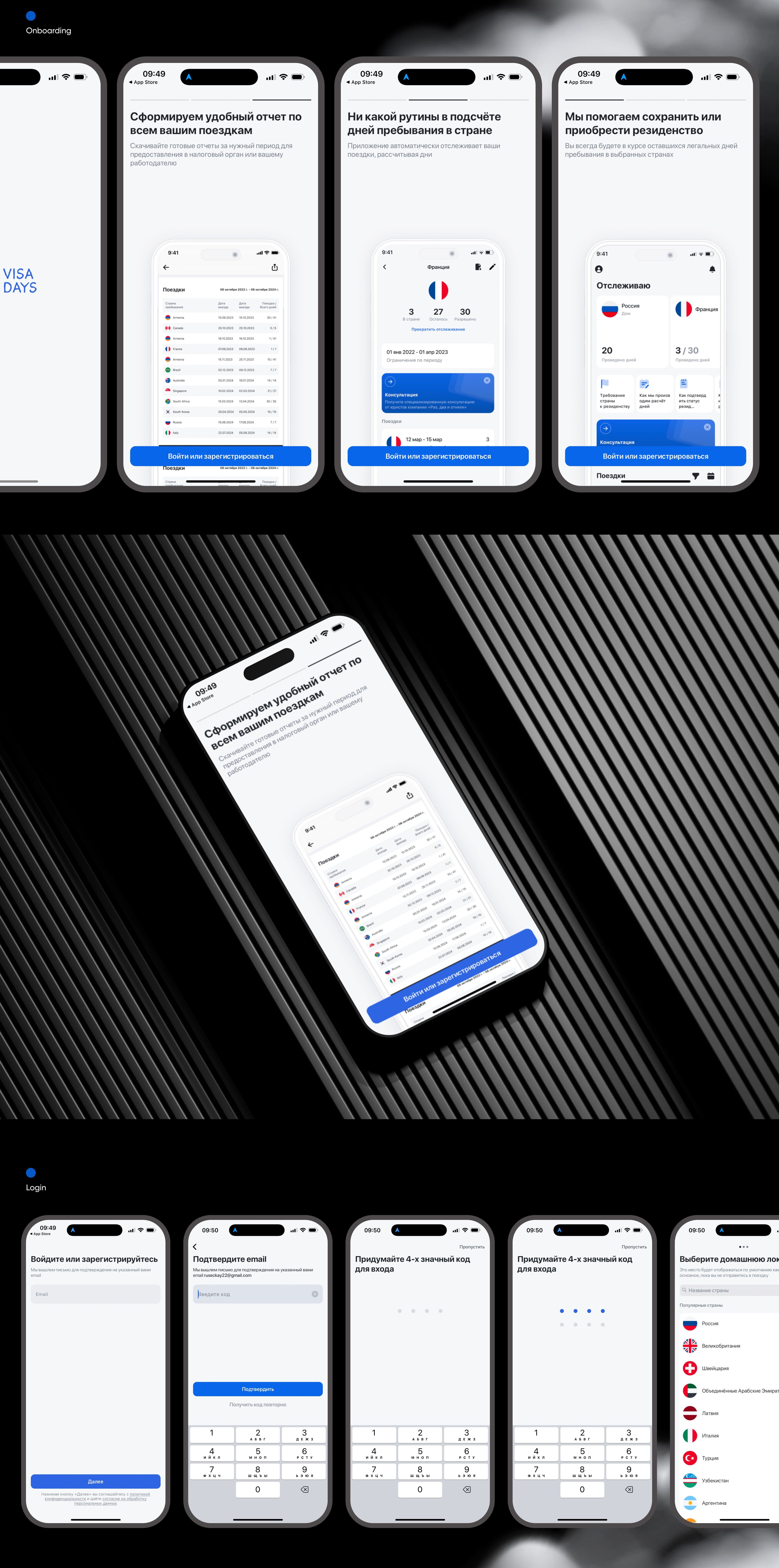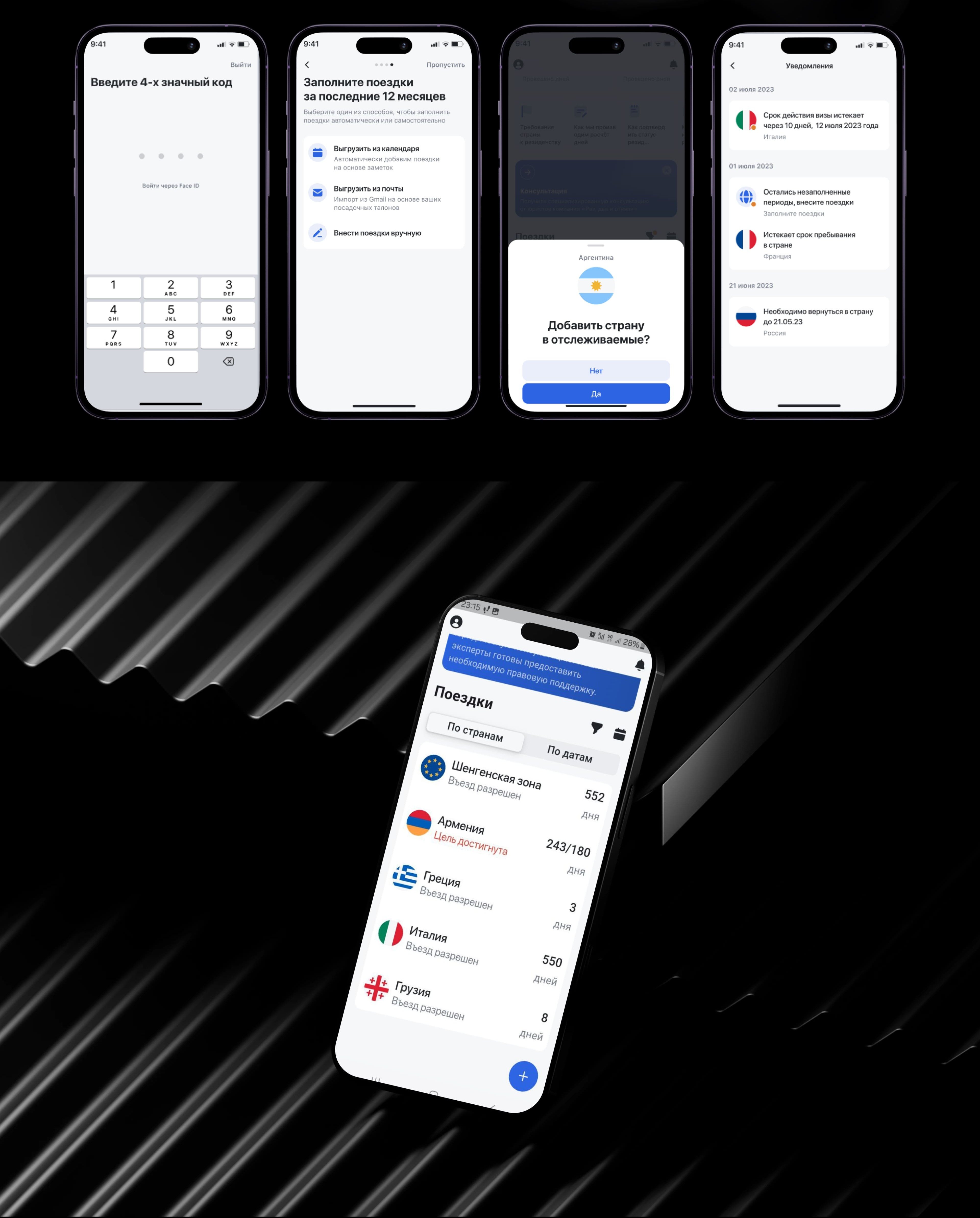 Сначала мы определили ключевой функционал, необходимый пользователю: отслеживание дней пребывания в разных странах с учётом целей поездки — будь то отдых, работа, лечение или учеба. Затем мы разработали простую и понятную архитектуру приложения, уделив особое внимание деталям дизайна для максимального удобства использования.