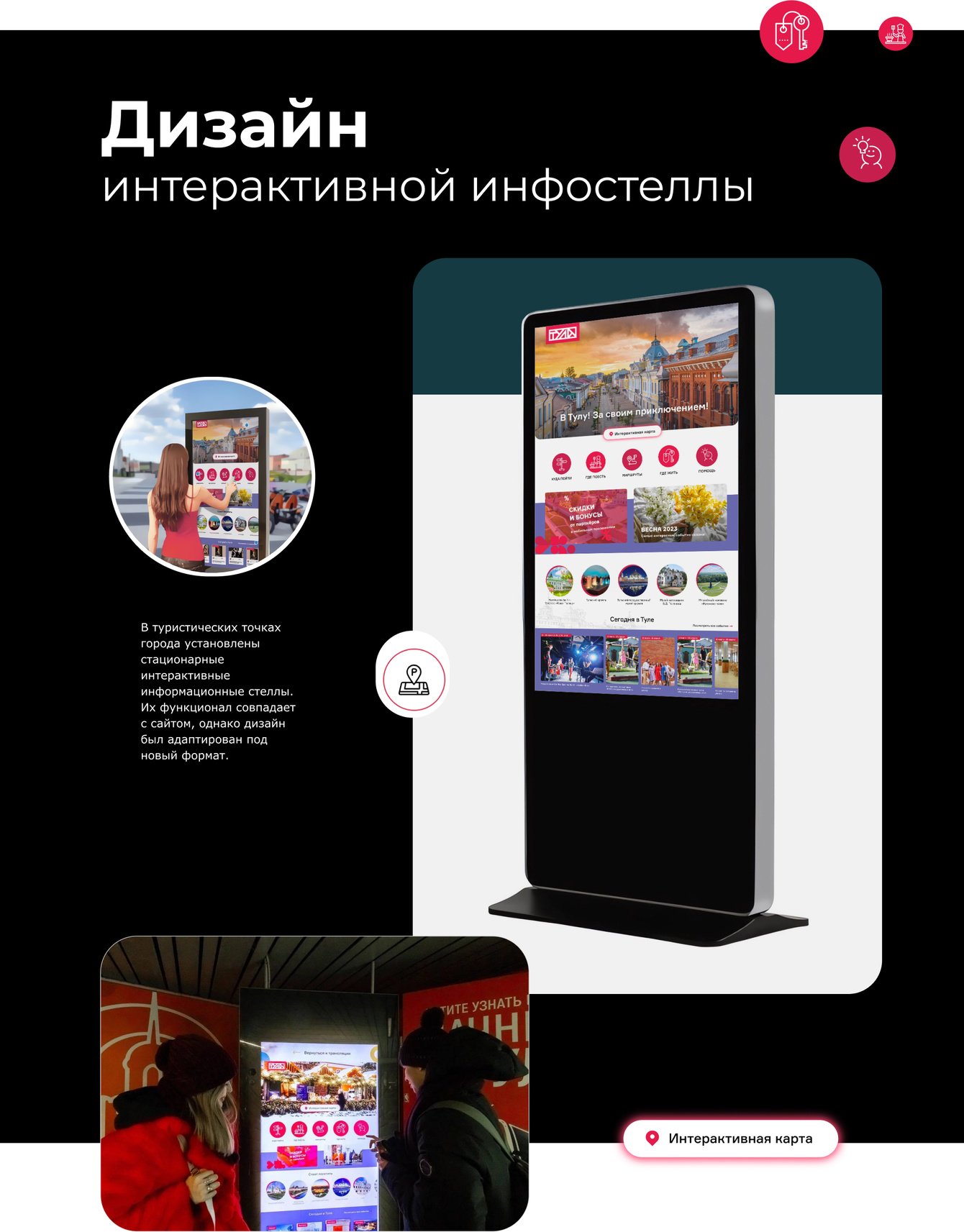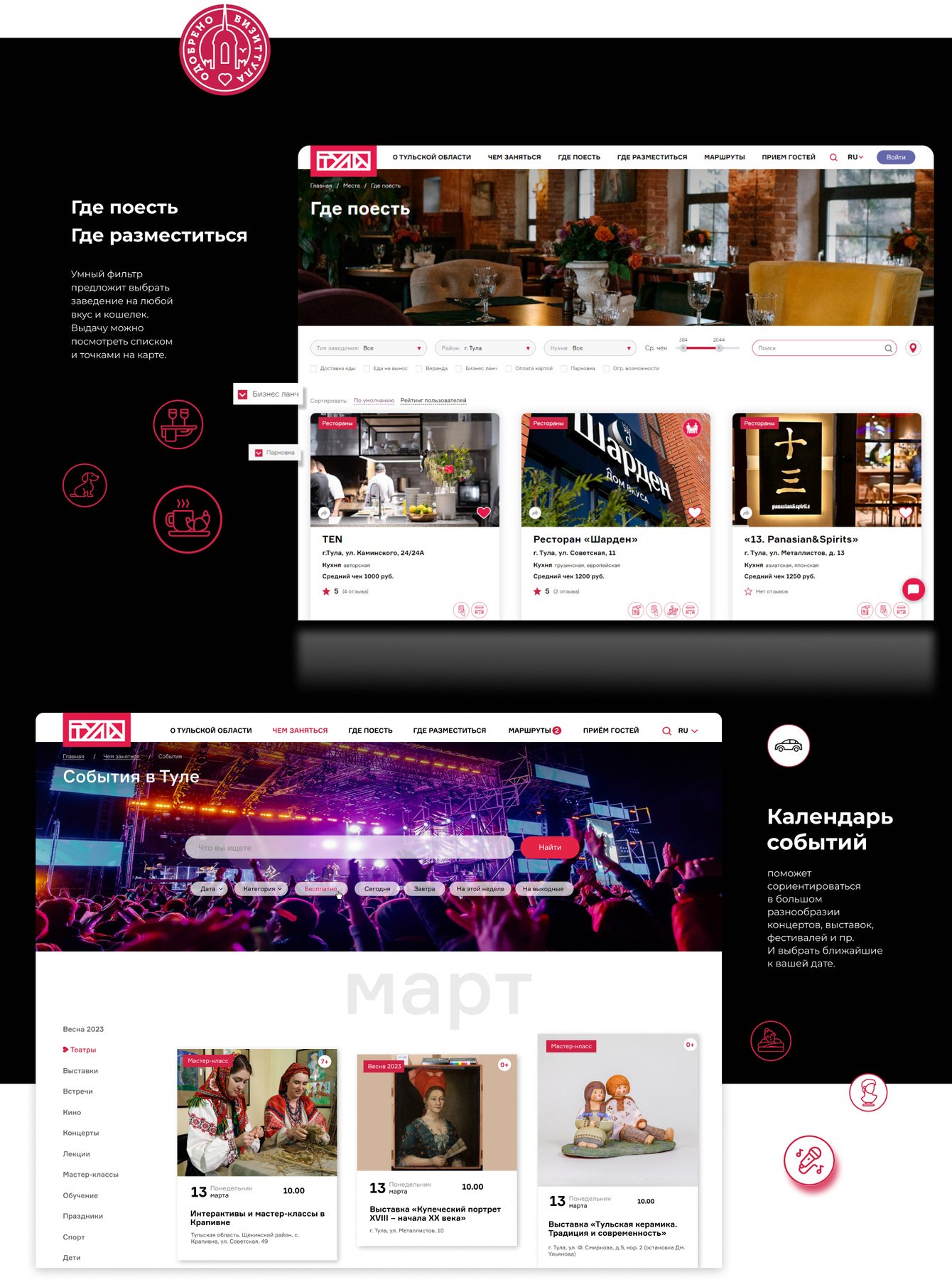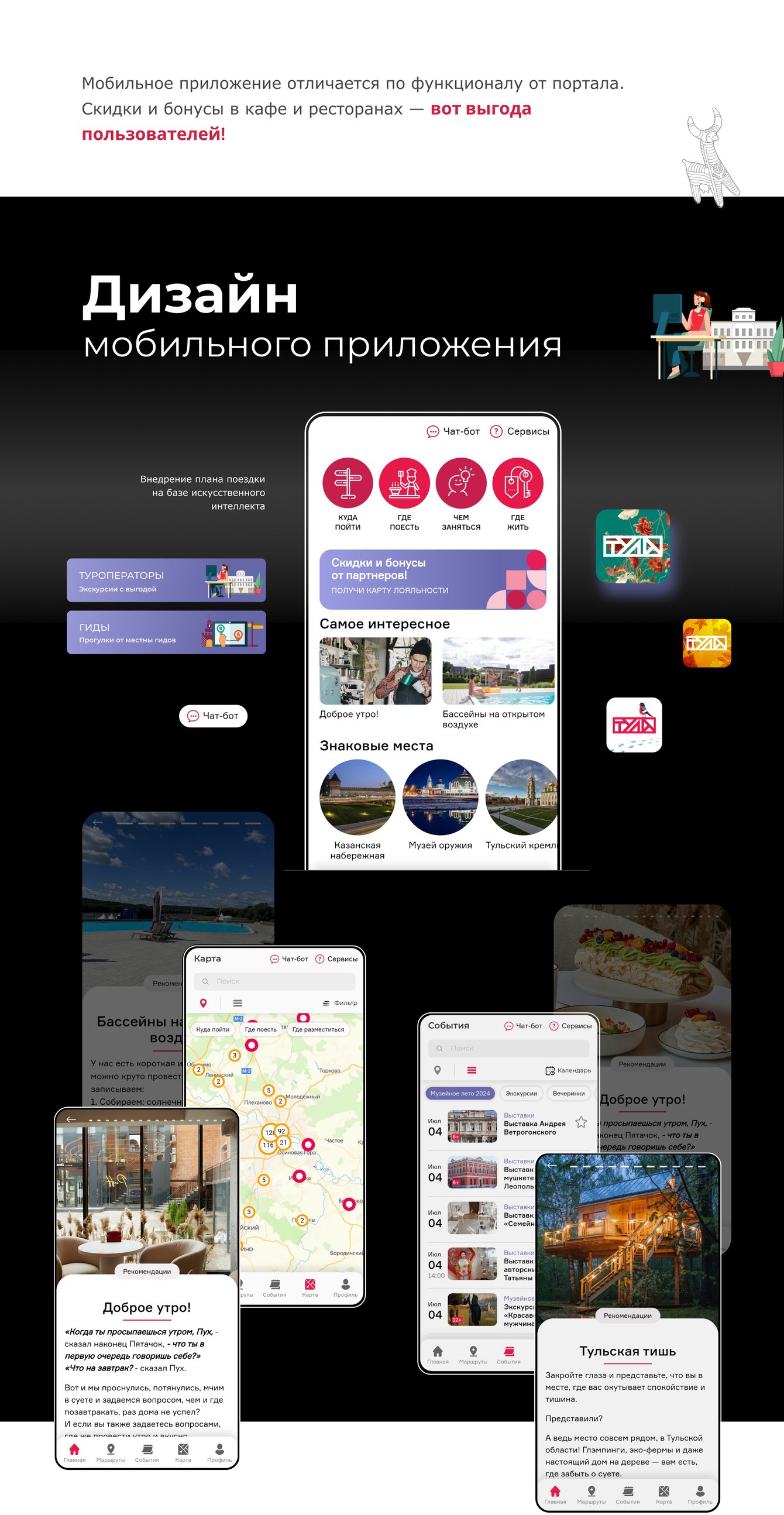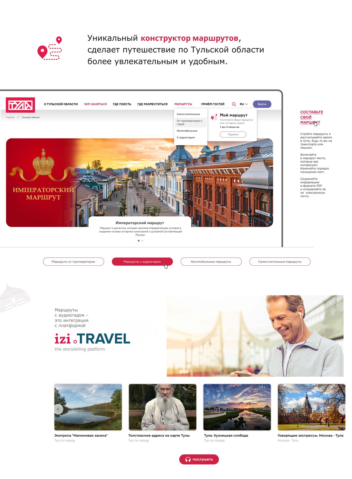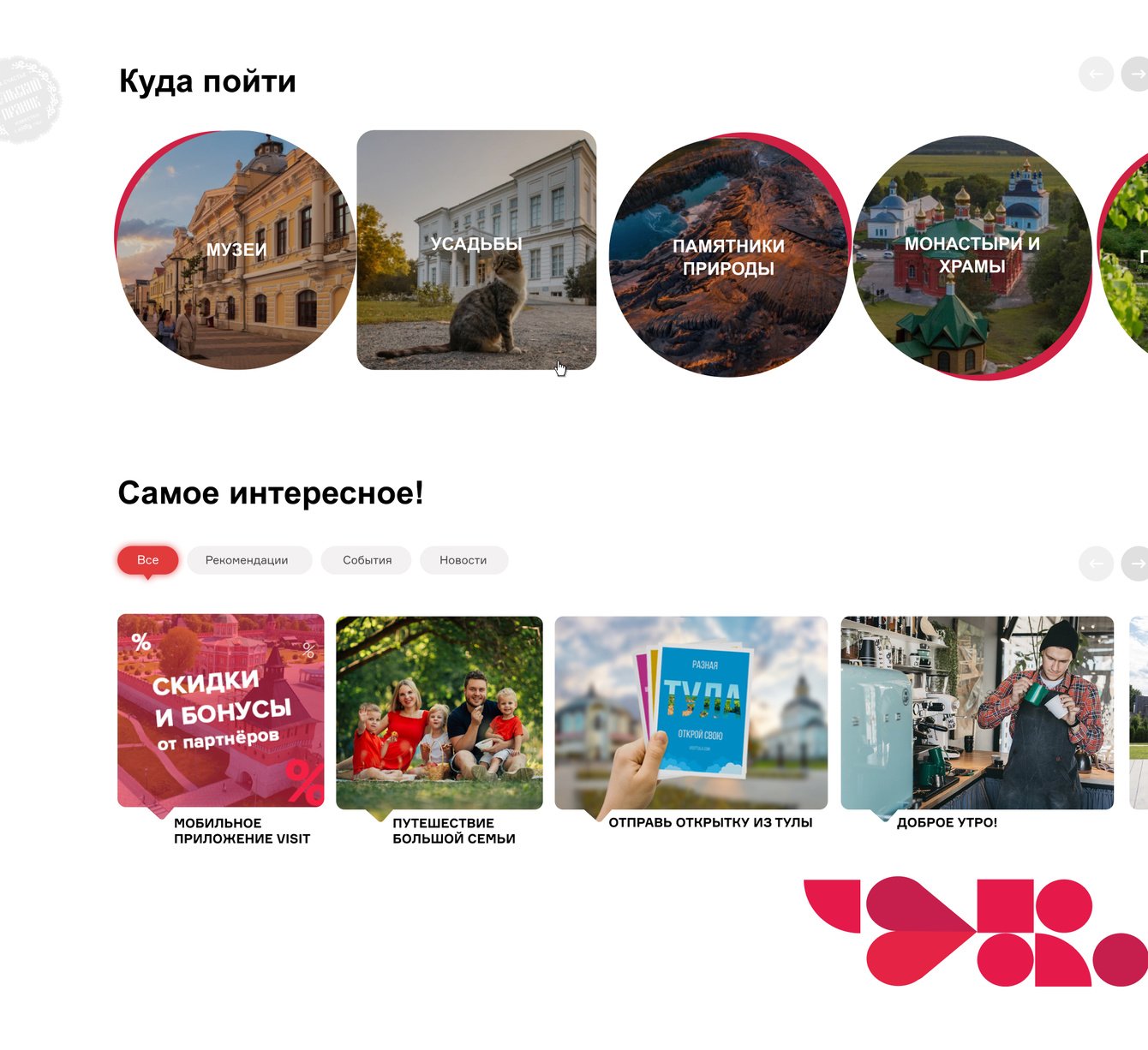 Платформа охватывает не только Тулу, но и весь регион — от Ясной Поляны Л.Н. Толстого до музеев в малых городах области. Особое внимание уделено продвижению культурного наследия: тульские самовары, оружейная история — всё это нашло отражение в дизайне и контенте портала.